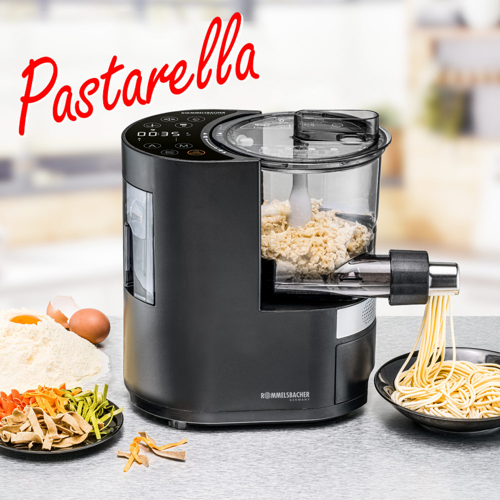 Die vollautomatische Nudelmaschine von ROMMELSBACHER produziert eine Vielfalt an Nudelsorten und ermöglicht darüber hinaus die Zubereitung individueller Rezepturen aus Zutaten nach eigener Wahl. Damit trifft sie genau den Kern der heutigen Essgewohnheiten. Denn der moderne Mensch drückt seinen persönlichen Lifestyle deutlich durch die Wahl seiner Lebensmittel aus. Ob vegan, glutenfrei, mit Ei oder Vollkorn – die elektronisch gesteuerte Nudelmaschine mit integrierter Waage und automatischer Wasserzufuhr liefert bis zu 800 g Nudeln in einem Durchlauf. Sieben klassische Nudelformen sind möglich, so dass viel Abwechslung auf den Tisch kommt. Die Bedienung ist einfach und komfortabel über 6 vollautomatische und 2 manuelle Programme, wobei der Nutzer auch in die Teigbereitung eingreifen kann. Die Teigausbeute ist hoch und direkt nach dem Herauspressen werden die Nudeln über einen Lüfter angetrocknet, um ein Zusammenkleben zu verhindert. Sehr praktisch ist die integrierte Zubehörbox zur hygienischen Aufbewahrung der 7 Nudelform-Einsätze (Matrizen). Robuste, hochwertige Materialien, zahlreiche Sicherheitsfeatures, das leuchtstarke LED Display und die einfache Reinigung machen Pastarella zum perfekten Nudel-Vollautomaten für ernährungsbewusste Familien und alle Pasta-Liebhaber.