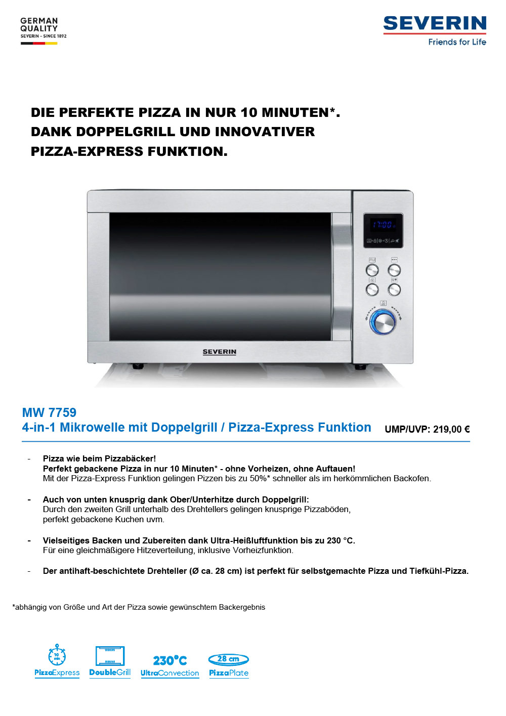 Die Pizza ist in Deutschland zum festen Bestandteil der Ernährung geworden. Mehr als 1 Milliarde Stück gelangen jährlich auf die Teller. In Zeiten der Covid-19 Pandemie stieg der Absatz sogar um weitere 7%. Neben Tiefkühlpizza sind selbstverständlich auch selbst zubereitete Pizzen beliebt. Ab jetzt schmecken diese Pizzen auch zu Hause genauso, wie sie sollen. Die Pizza-Express-Mikrowelle MW 7759 ist ein echtes Highlight in der SEVERIN Mikrowellen-Welt und extra für alle Pizza-Fans entwickelt worden! Bis zu 230 °C, kein Vorheizen, fein zerlaufener Käse bei krossem Boden – so macht sie jedem Pizzaofen Konkurrenz.