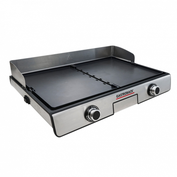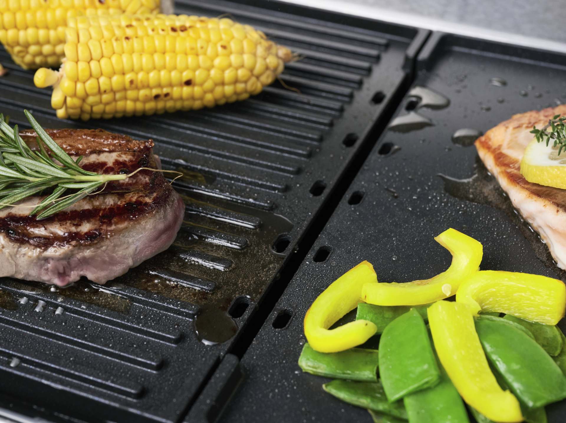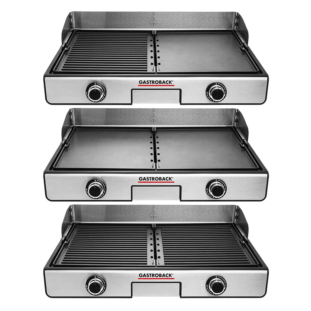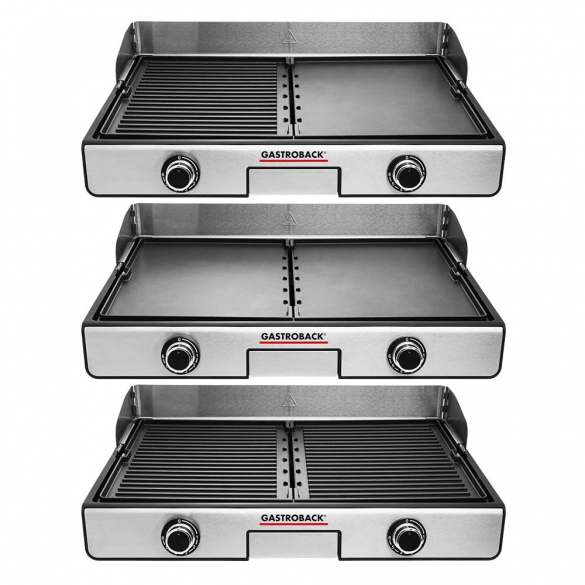 Der Clou dabei, jede Grillplatte ist mit einer glatten Plancha-Seite und einer geriffelten BBQ-Seite ausgestattet, sie lassen sich nach Belieben drehen und wenden. So sorgt der Design Tischgrill Plancha & BBQ für vielfältige Grillmöglichkeiten, zum Beispiel mit der glatten Plancha-Grillfläche für mediterrane Grillrezepte, Fischfilets, Meeresfrüchte oder Gemüse und auch für Pancakes, French Toast, Bacon, Spiegelei, Omelett oder Bratkartoffeln und auf der geriffelte BBQ-Grillfläche, welche für eine feine Zeichnung des Grillguts sorgt, für Fisch, Steaks, Burger und Würstchen. Wie von GASTROBACK® gewohnt, sind die Grillplatten antihaftbeschichtet, so muss zum Grillen nur wenig, bis gar kein zusätzliches Fett hinzugegeben werden.