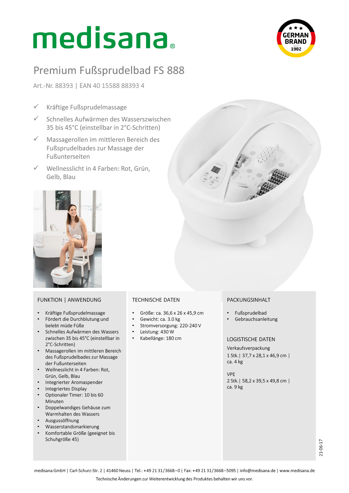 Ein entspannendes Fußbad kann dabei helfen, dass sich unsere beanspruchten Füße nach einem langen Tag wieder wohlfühlen und wir vital in den nächsten Tag starten können. Das neue Premium Fußsprudelbad FS 888 von medisana bietet dank seiner vielfältigen Funktionen ein rundum Wellness-Gesamtpaket. Die kräftige Sprudelfunktion sorgt für die Durchblutung und Regeneration beanspruchter Füße. Gleichzeitig können die Fußreflexzonen mithilfe von sechs Massagerollen im mittleren Bereich des Gerätes massiert und verspannte Muskeln gelockert werden.