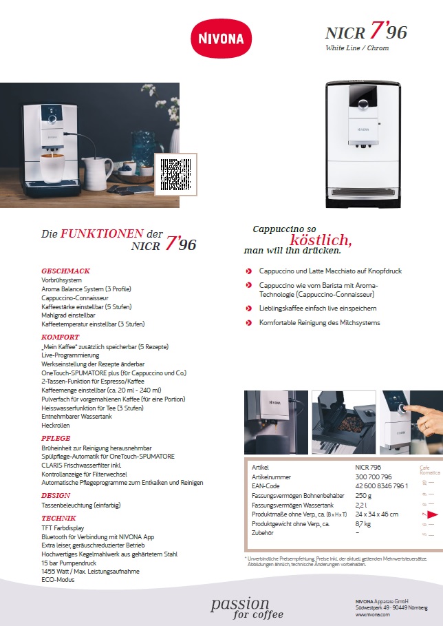 Neuheit 2021: Einfache Bedienung, einfache Reinigung – und eine elegante Front in Weiß. Die NICR 796 gehört zu unserer 7er-Baureihe und ist der perfekte Einstieg in die Welt des Cappuccinos auf Knopfdruck. Dazu sorgen das Aroma Balance System und der Cappuccino Connaisseur für einmalige Genussmomente.