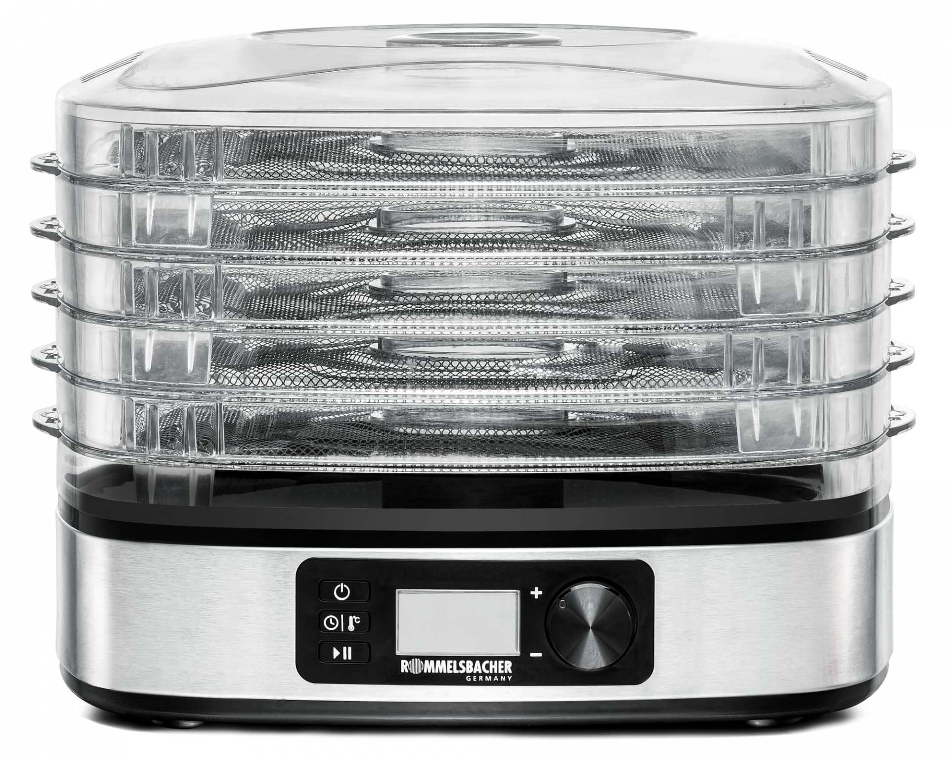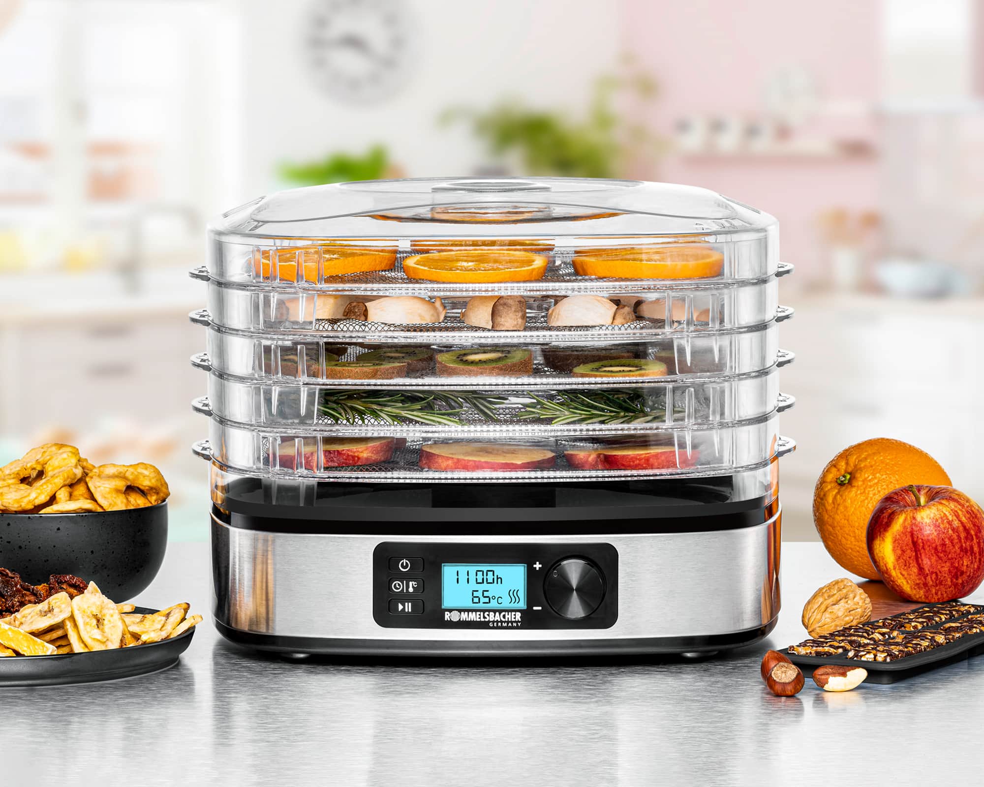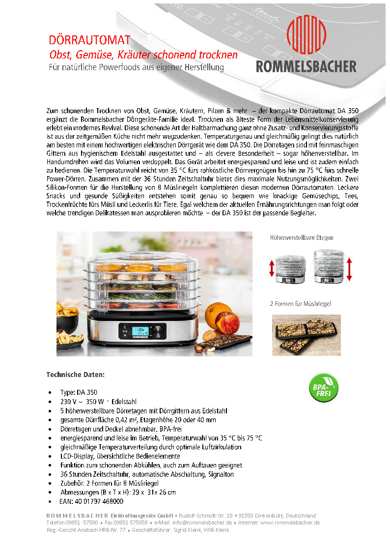 Zum schonenden Trocknen von Obst, Gemüse, Kräutern, Pilzen & mehr – der kompakte Dörrautomat DA 350 ergänzt die Rommelsbacher Dörrgeräte-Familie ideal. Trocknen als älteste Form der Lebensmittelkonservierung erlebt ein modernes Revival. Diese schonende Art der Haltbarmachung ganz ohne Zusatz- und Konservierungsstoffe ist aus der zeitgemäßen Küche nicht mehr wegzudenken. Temperaturgenau und gleichmäßig gelingt dies natürlich am besten mit einem hochwertigen elektrischen Dörrgerät wie dem DA 350. Die Dörretagen sind mit feinmaschigen Gittern aus hygienischem Edelstahl ausgestattet und – als clevere Besonderheit – sogar höhenverstellbar. Im Handumdrehen wird das Volumen verdoppelt. Das Gerät arbeitet energiesparend und leise und ist zudem einfach zu bedienen. Die Temperaturwahl reicht von 35 °C fürs rohköstliche Dörrvergnügen bis hin zu 75 °C fürs schnelle Power-Dörren. Zusammen mit der 36 Stunden Zeitschaltuhr bietet dies maximale Nutzungsmöglichkeiten. Zwei Silikon-Formen für die Herstellung von 8 Müsliriegeln komplettieren diesen modernen Dörrautomaten. Leckere Snacks und gesunde Süßigkeiten entstehen somit genau so bequem wie knackige Gemüsechips, Tees, Trockenfrüchte fürs Müsli und Leckerlis für Tiere. Egal welchem der aktuellen Ernährungsrichtungen man folgt oder welche trendigen Delikatessen man ausprobieren möchte – der DA 350 ist der passende Begleiter.