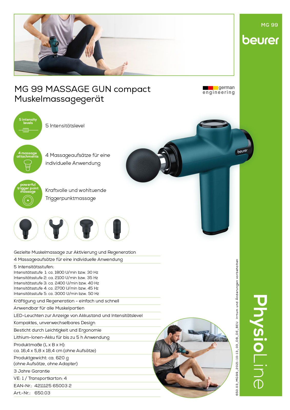 Die MG 99 compact ist optimal für den Einsatz zu Hause, im Fitnessstudio oder unterwegs geeignet. Durch das ergonomische Design ist sie besonders leicht und leise, im Akkubetrieb überall einsetzbar und sie passt perfekt in jede Sporttasche. Mit vier unterschiedlichen Aufsätzen (Kugelkopf, Spiralkopf, U-förmiger Kopf und flacher Kopf) für die individuelle Anwendung sowie fünf Intensitätslevel lockert das Muskelmassagegerät beanspruchte Muskelpartien schnell und wohltuend. Die LEDs am Gerät zeigen die Intensitätsstufe und den Akkustand an. Die Massage Gun besticht durch ihr unverwechselbares Design und die moderne Farbe in Petrol Metallic. In der niedrigsten Intensitätsstufe sorgt das Gerät dank Lithium-Ionen-Akku für bis zu fünf Stunden kabellose Anwendung. Die vollständige Ladezeit beträgt circa 3,5 Stunden. Die MG 99 compact besitzt eine Abschaltautomatik, die das Programm nach der empfohlenen Anwendungsdauer von zehn Minuten automatisch beendet.