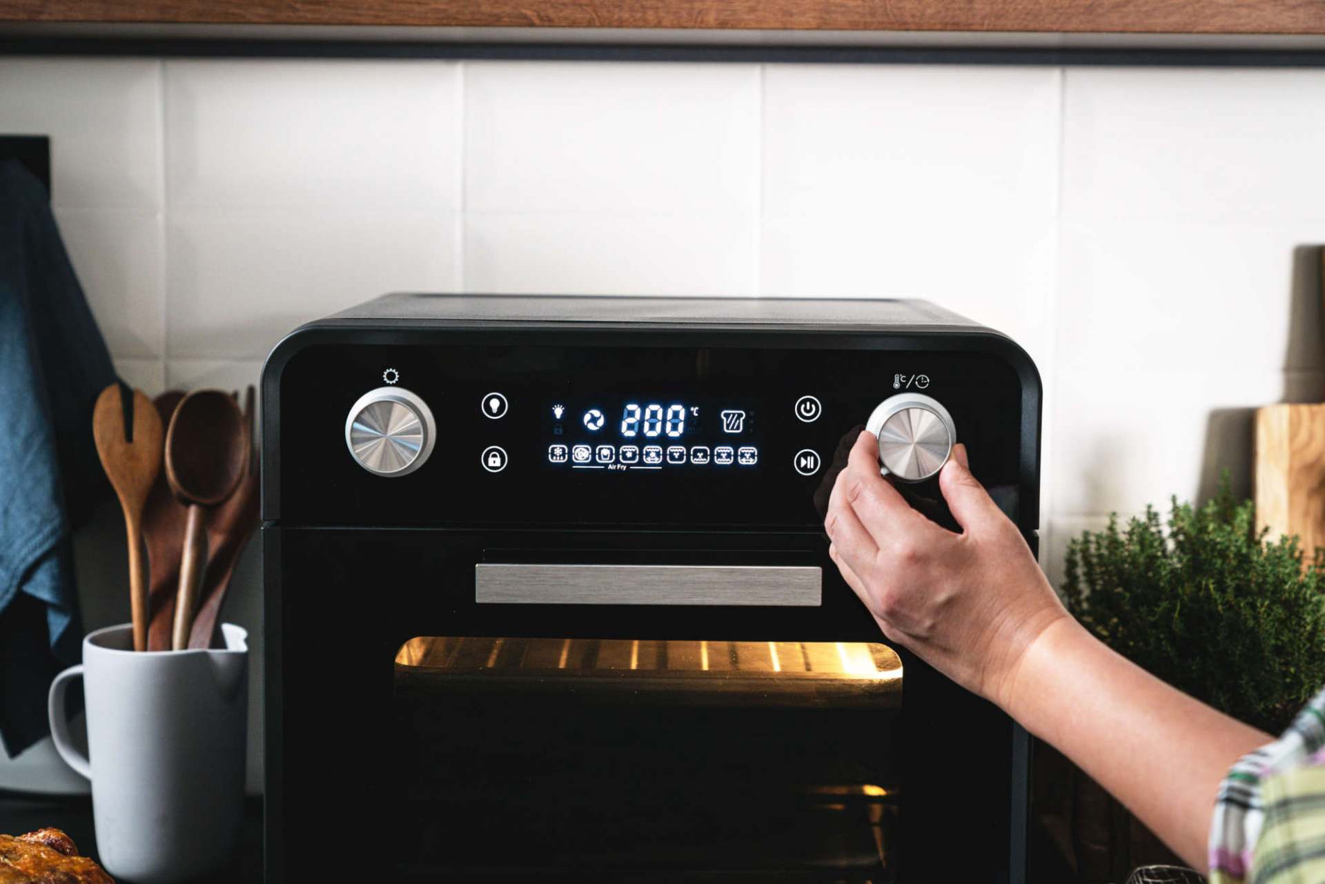 Ein im Lieferumfang enthaltener Drehspieß für knusprige Grillhähnchen oder Schaschlik lässt keine Wünsche offen. Dieser kompakte Multifunktionsofen kann aber noch mehr als viele gro-ße Backöfen, eine Hochleistungs-Air-Fry-Funktion garantiert viele Zubereitungsmöglichkeiten in Rekordzeit. 4 voreingestellte Programme sorgen dabei für perfekte Ergebnisse, einfach das passende Programm (Toasten, Auftauen, Pizza und Pommes Frites) über das beleuchtete Sensor Touch-Display auswählen und starten, den Rest erledigt die automatische Steuerung. Mit dem Custom-Programm lassen sich Temperatur und Zeit auch individuell einstellen und auf mitgelie-fertem Pizzastein gelingen bis zu 30 cm große Pizzen, sowie im „Air Fry Korb“ zum Beispiel Pommes Frites, besonders schnell und knusprig.