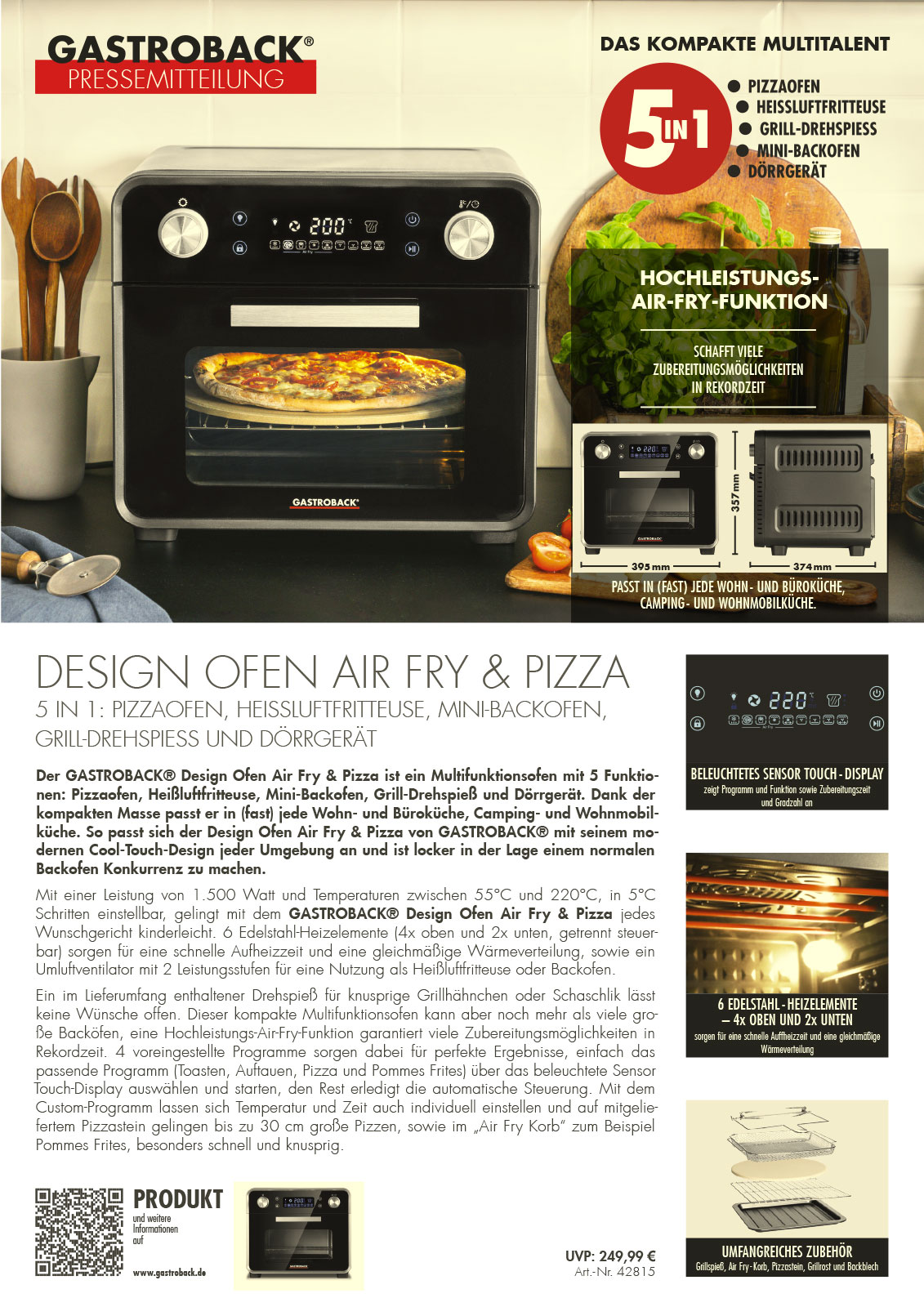 Der GASTROBACK® Design Ofen Air Fry & Pizza ist ein Multifunktionsofen mit 5 Funktio-nen: Pizzaofen, Heißluftfritteuse, Mini-Backofen, Grill-Drehspieß und Dörrgerät. Dank der kompakten Masse passt er in (fast) jede Wohn- und Büroküche, Camping- und Wohnmobil-küche. So passt sich der Design Ofen Air Fry & Pizza von GASTROBACK® mit seinem mo-dernen Cool-Touch-Design jeder Umgebung an und ist locker in der Lage einem normalen Backofen Konkurrenz zu machen.