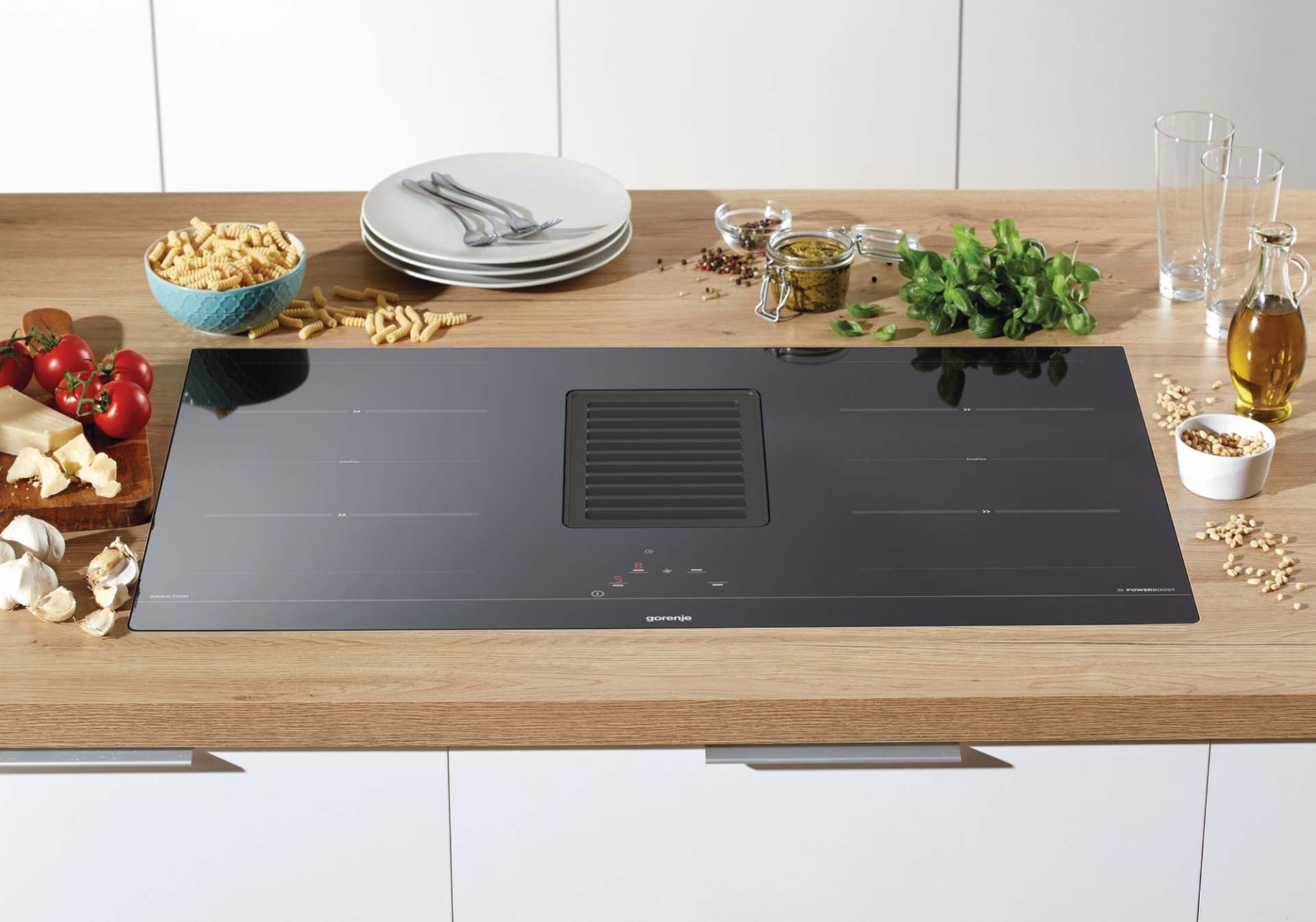 Neu in der ComfortLine von Gorenje ist der Kochfeldabzug HET949BSC, der flächenbündig oder aufliegend eingebaut werden kann. Die elektronische Steuerung über TouchControl macht die Bedienung als auch Reinigung besonders einfach. Die Fettfilter sind spülmaschinengeeignet und lassen sich leicht entfernen. Mit AreaFlex können zwei vertikale Kochzonen verbunden werden, wodurch eine große Kochfläche entsteht. Wertige Edelstahlklappen verschließen nach dem Kochen die Einströmöffnung und sind damit ein Geruchsverschluss. Der Lüftermotor liegt direkt unter dem Kochfeld, sodass kein Stauraum im Schrank verloren geht. Das Zubehör für die überwiegende Umluftinstallation ist im Lieferumfang enthalten. Selbstverständlich kann auch in Abluft installiert werden.