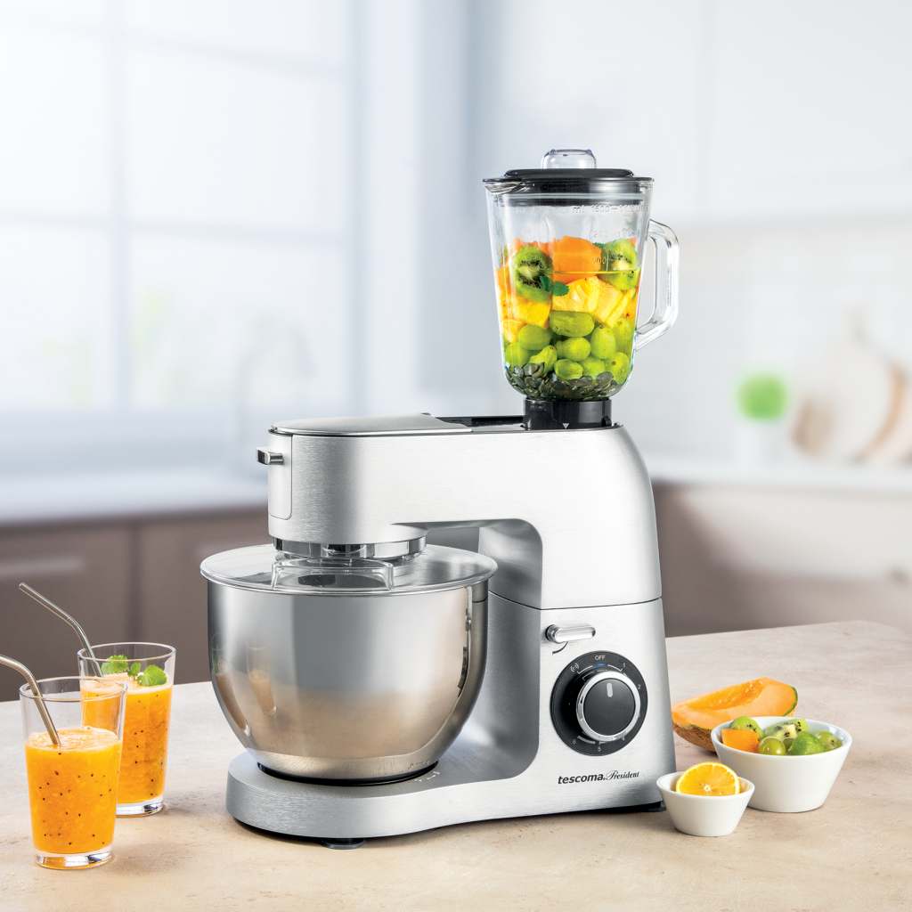 - Leistungsstarker Mixeraufsatz mit einer Schüssel aus dickwandigem Glas: Sechs Geschwindigkeitsstufen, Pulsfunktion, stabile Fixierung auf den Untergrund