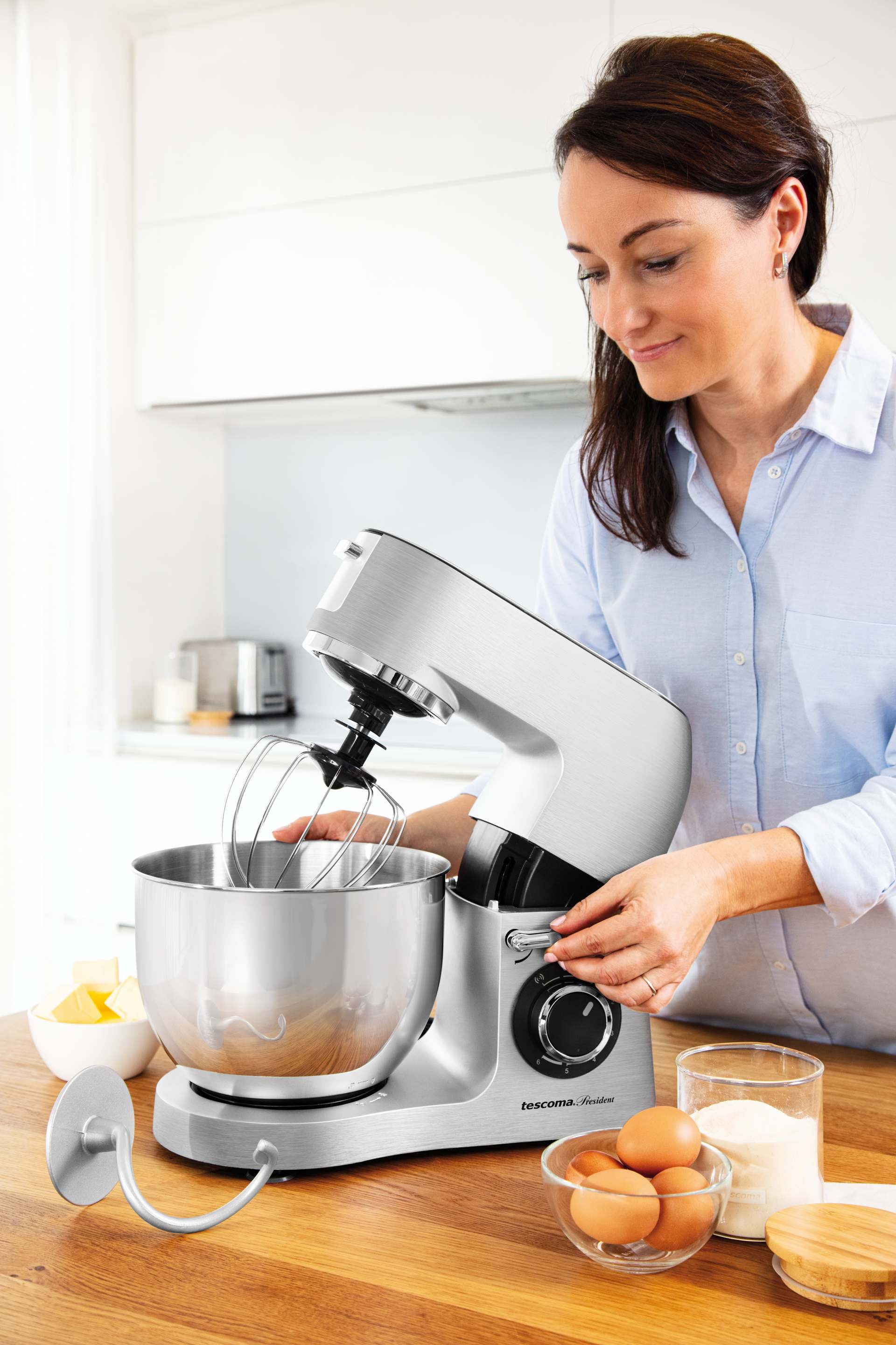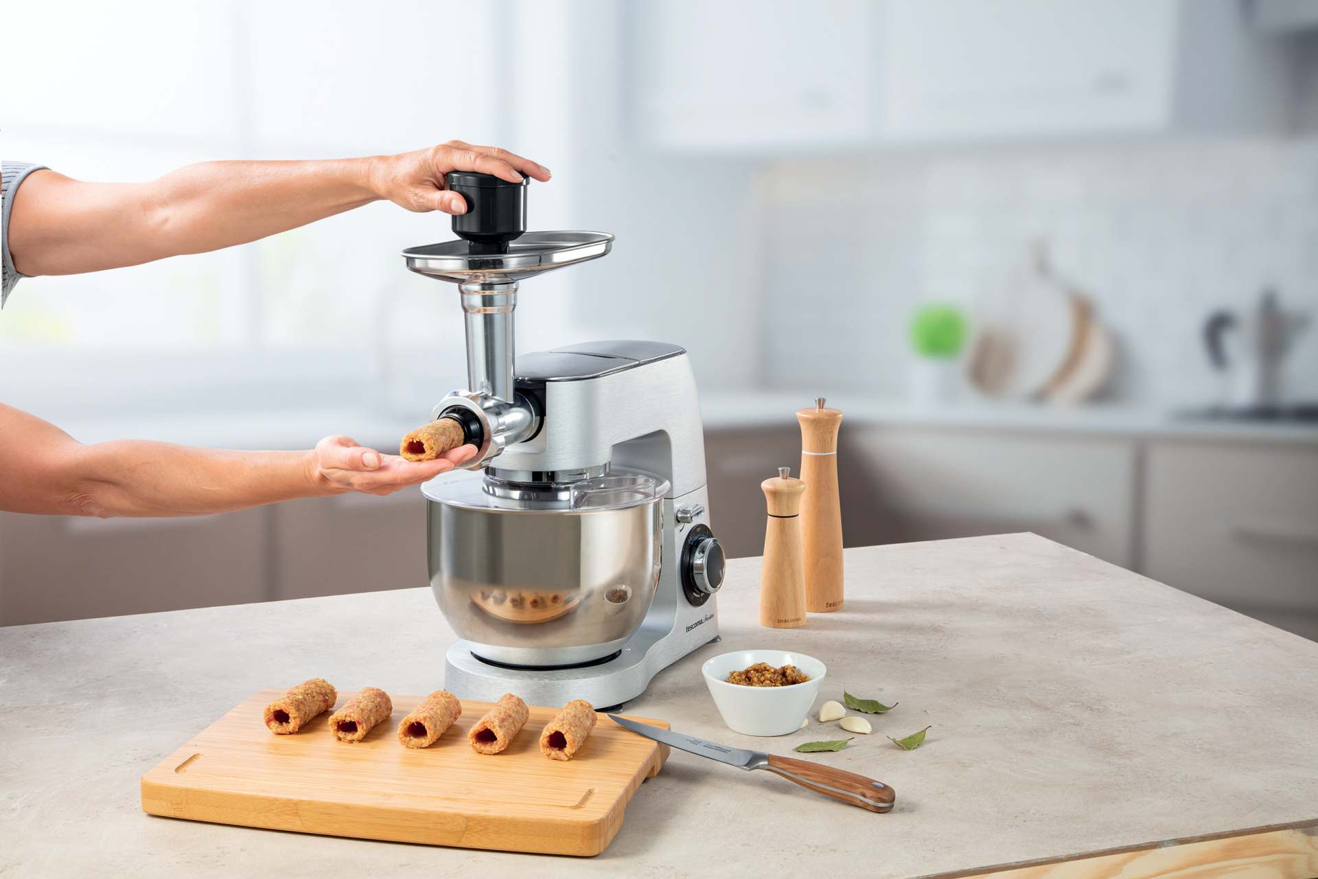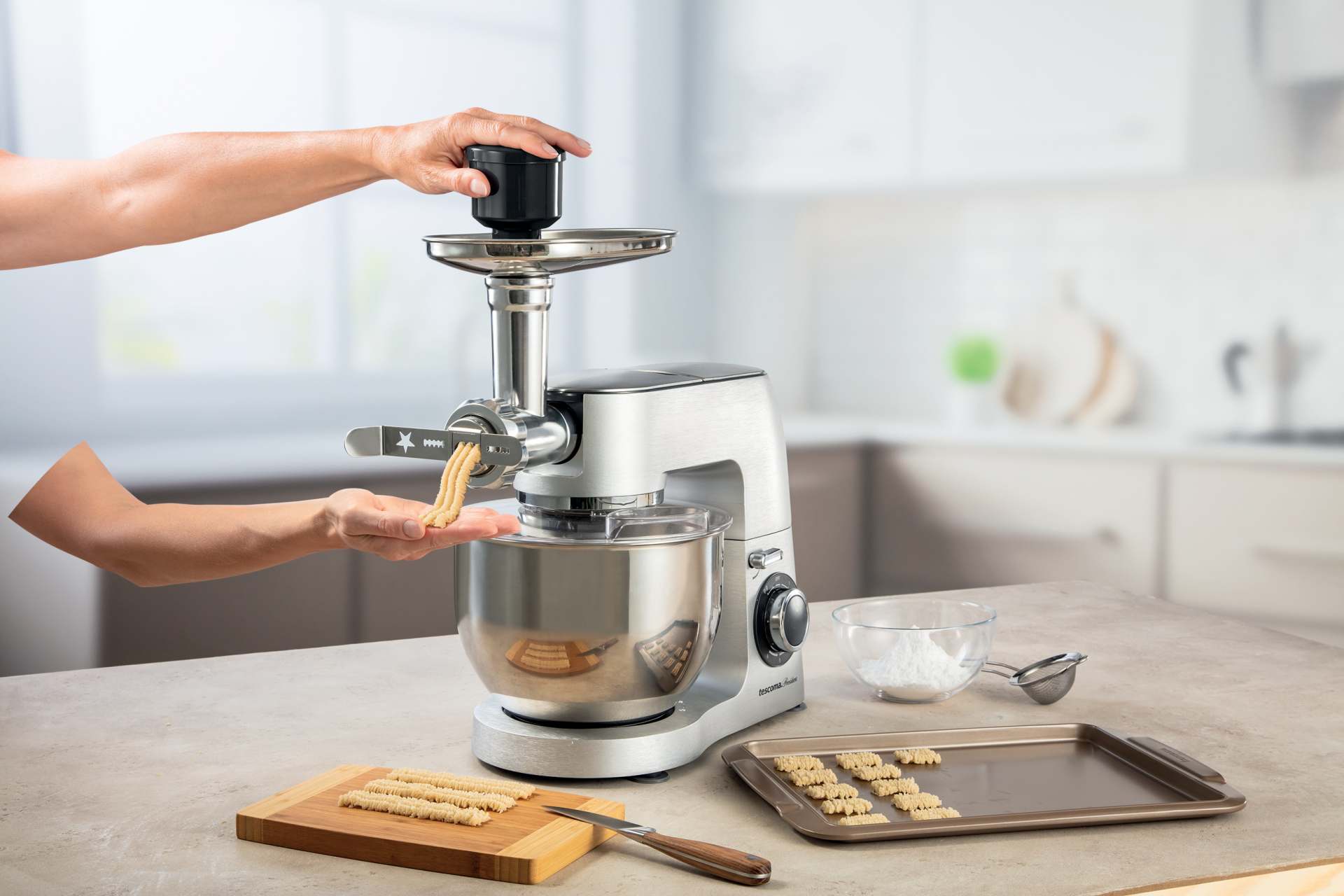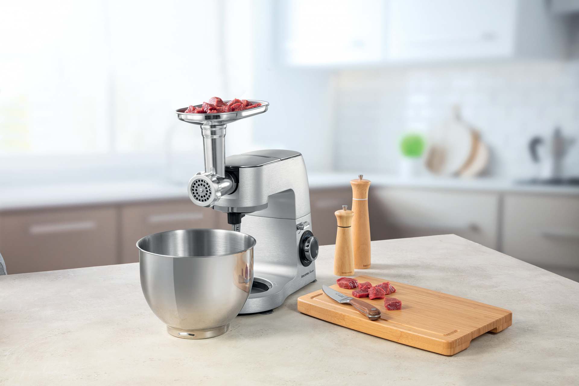 Exzellente Küchenmaschine mit geräuscharmem Lauf, reichhaltiger Ausstattung und Zubehör. Alle Teile inklusive Getriebe sind aus rostfreiem Edelstahl.