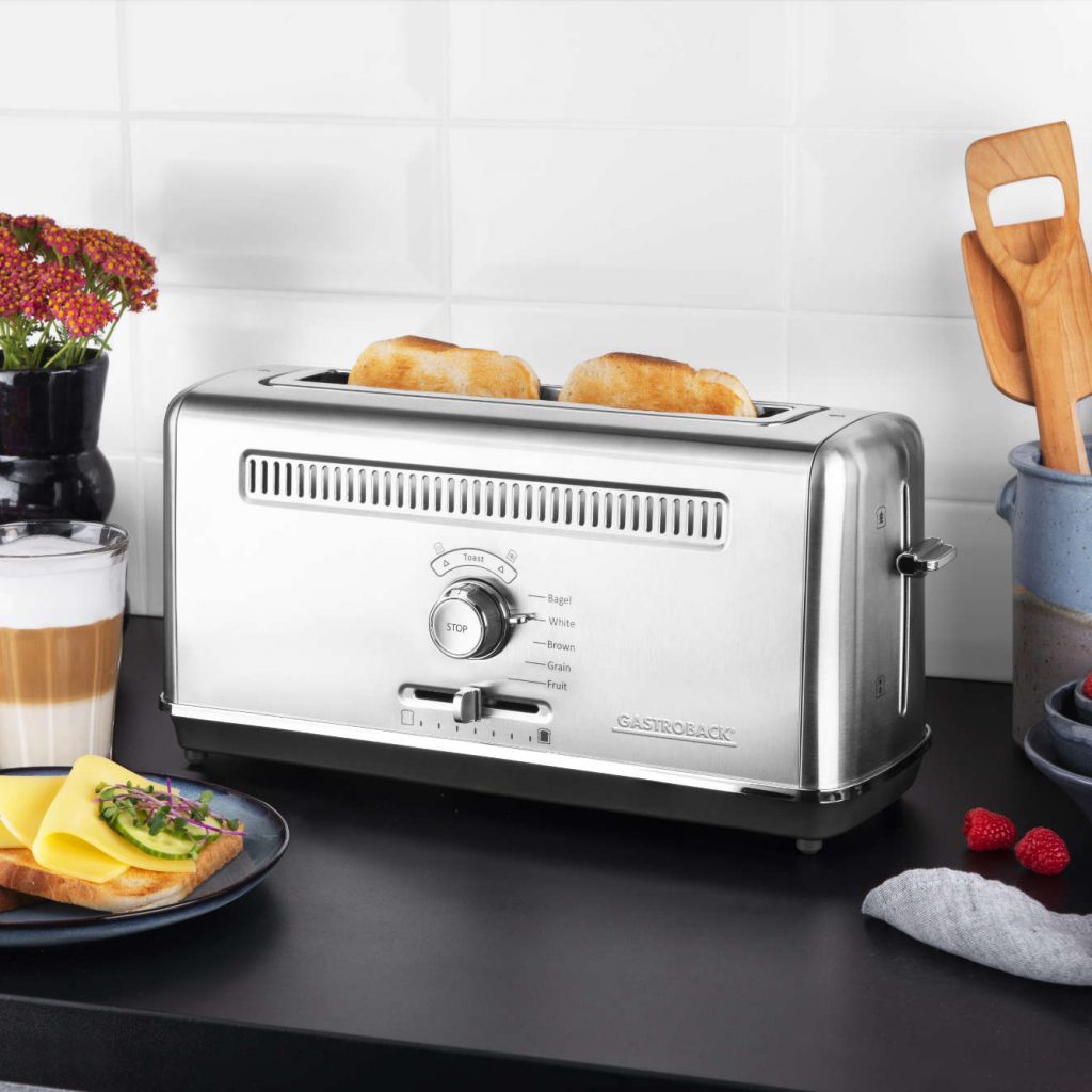 Der GASTROBACK® DESIGN TOASTER ADVANCED 4S im modernen, schlanken Retro-Edelstahlgehäuse mit extralangem Toastschacht (26 cm) ist elektronisch geregelt und garantiert so ein immer gleiches Toastergebnis, vom ersten bis zum letzten Toast. Dabei steuert den Toaster ein elektronischer Temperatursensor, welcher die Toastzeit automatisch an die eingestellte Brotsorte und die gewünschte Bräunungsstufe anpasst. Verkohlte oder labbrig-weiche Toasts gehören von nun an der Vergangenheit an.