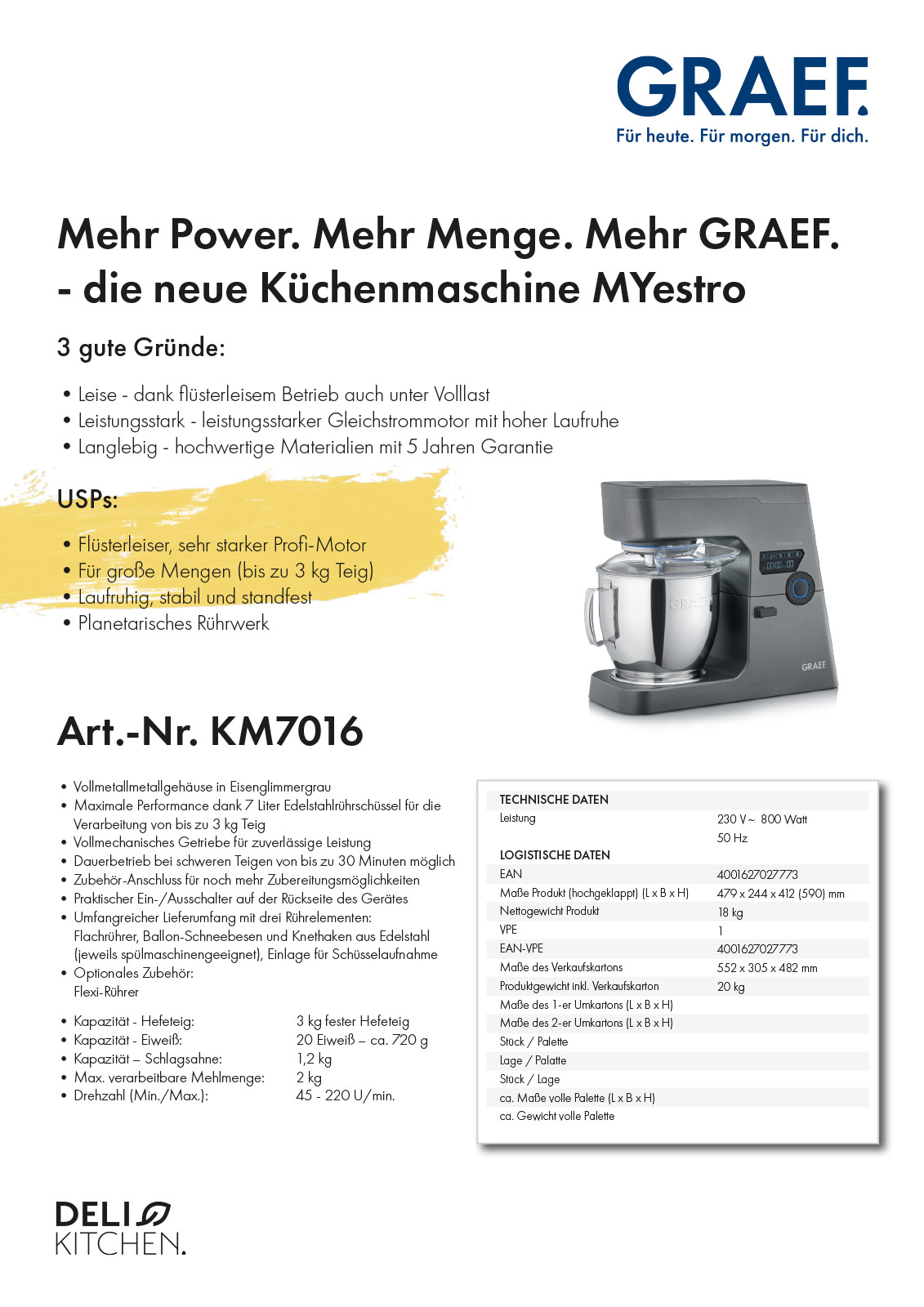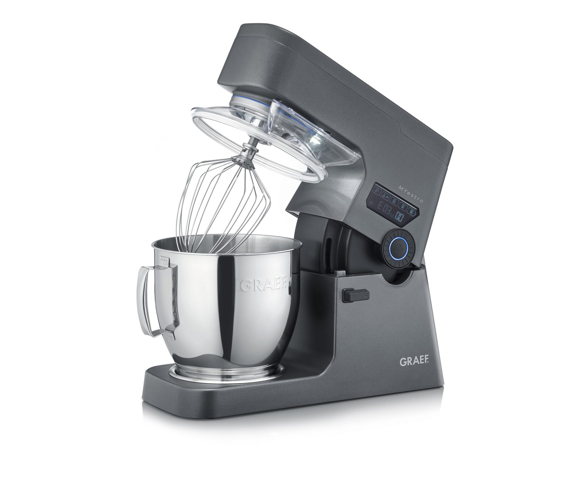 Mit der neuen MYestro hält ein neues Flaggschiff Einzug in das DeliKitchen-Sortiment des Sauerländer Küchengeräteherstellers. Die erste Küchenmaschine aus dem Hause GRAEF ist ein absolutes Kraftpaket und der perfekte Küchenpartner für Brotfans, Familien und Hobbybäcker:innen mit großem Appetit. Vor allem dann, wenn es um das heimische Backen der „Laibspeise“ mit knuspriger Kruste und saftiger Krume geht. Der Grund: Die MYestro ist mit einem leistungsstarken 800-Watt-Profi-Gleichstrommotor ausgestattet. Damit verarbeitet sie nicht nur schwere (Brot-)Teige und große Mengen in der 7-Liter-Edelstahlschüssel mit meisterlicher Leichtigkeit, sondern knetet, rührt und schlägt selbst im Volllastbetrieb flüsterleise und mit hoher Laufruhe. Das planetarische Rührwerk, der abnehmbare Spritzschutz mit extragroßer Einfüllöffnung und die sehr helle Schüsselbeleuchtung lassen jedes Backvorhaben im Handum-drehen gelingen. Darüber hinaus punktet die Küchenmaschine mit hochwertigem Vollmetallgehäuse und mit 5 Jahren Garantie auch in Sachen Langlebigkeit und Ausdauer. Das massive, moderne Design mit Blue-Ambience-Beleuchtung, Touch-Display und drei formschönen Rührelementen überzeugt dabei ambitionierte Backfans und Küchenästheten:innen gleichermaßen.