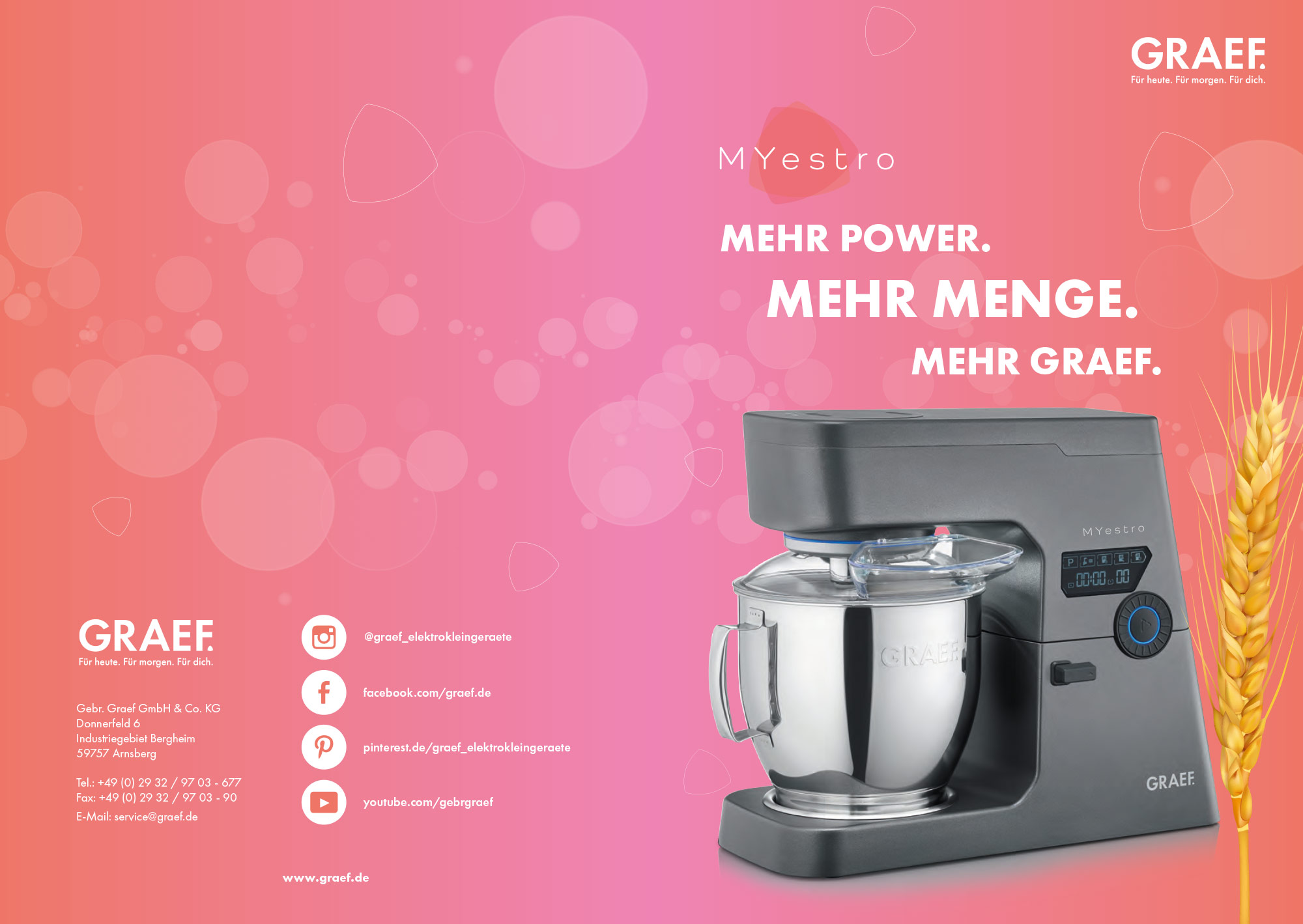 Kräftiges Sauerteigbrot für die fünfköpfige Familie, fluffig-lockere Hefeteigschnecken für die ganze Verwandtschaft oder eine dreistöckige, bunte Torte für den Kindergeburtstag. Wenn Teigdichte und Menge bei den Backvorhaben herausfordernd werden, steht die GRAEF MYestro zuverlässig zur Seite. Denn Power und Menge sind ihr Steckenpferd – die überaus leistungsstarke Maschine ist – anders als die meisten handelsüblichen Küchenmaschinen – mit einem professionellen 800-Watt-Profi-Gleichstrommotor mit Riemenantrieb ausgestattet. Dieser bietet ein optimales Verhältnis von Energieverbrauch und Leistungsstärke, hat einen deutlich höheren Wirkungsgrad und arbeitet dadurch energieeffizienter als vergleichsbare andere Motoren mit höherer Leistung. Das Ergebnis: Die MYestro verarbeitet mühelos schwere Teige und schnurrt auch bei Volllastbetrieb immer noch flüsterleise und mit höchster Laufruhe. Das ausbalancierte Vollmetallgehäuse und das solide Produktgewicht von 18 Kilogramm schaffen eine einzigartige Standfestigkeit, die verhindert, dass sich die Maschine vor lauter Arbeitseifer selbst von der Küchenplatte knetet. Zuverlässig, ausdauernd und zeitlos – mit der Verarbeitung langlebiger Materialien, der Garantie von fünf Jahren und der stilvollen Blue-Ambience-Beleuchtung sorgt GRAEF auch dafür, dass der heimische Nachschub an selbst gebackenem Brot, Brötchen und Gebäck gewährleistet bleibt.