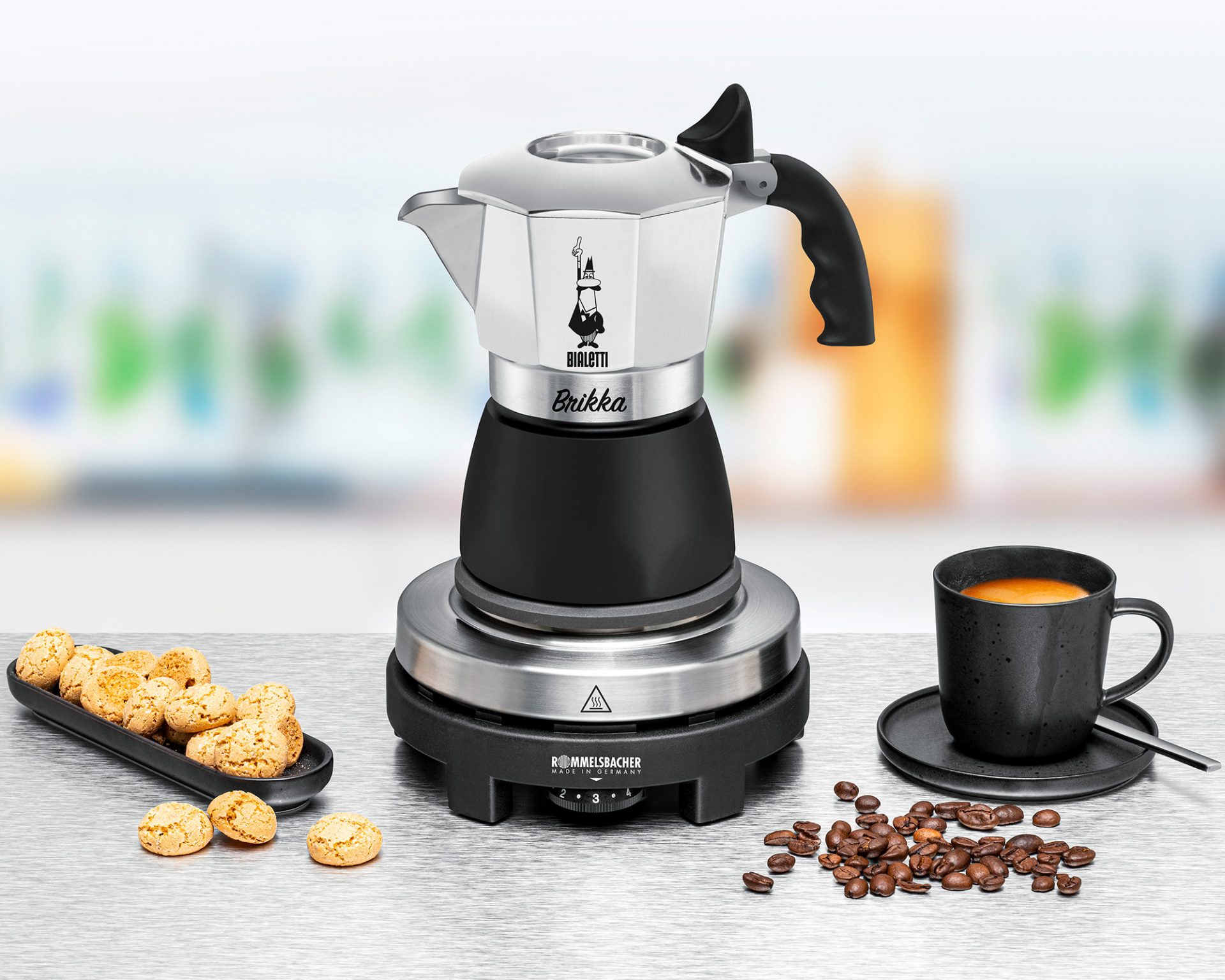Mit dem Espresso Geschenkset verschenkt man pures Kaffeeglück für zu Hause, für die Reise und fürs Büro. Im Set vereinen sich zwei langbewährte Produkte, die viel Kaffeefreude garantieren: eine ROMMELSBACHER Mini Reisekochplatte und eine originale Moka Kanne der italienischen Kultmarke Bialetti. Beide sind wie gemacht füreinander! Unsere RK 501 ist die kleinste ‚Made in Germany‘ Automatik Kochplatte der Welt und kann darüber hinaus als vollwertige kleine Kochstelle in der Küche und unterwegs eingesetzt werden. Die Espressokanne Modell ‚Brikka‘ überrascht durch ein ganz besonderes Detail: Durch ihr innovatives Brühsystem produziert sie Moka/Espresso mit echter Crema, was es bei traditionellen Moka Kannen so nicht gibt. Und damit die Beschenkten gleich nach dem Auspacken mit der Kaffeezubereitung beginnen können, liegt dem Geschenkset ein Päckchen mit original italienischem Bialetti Moka bei.