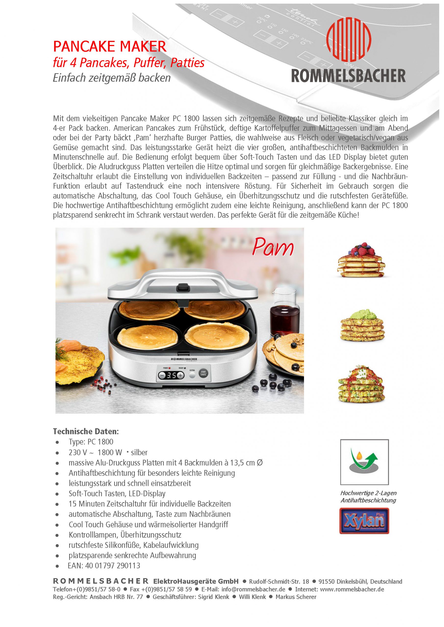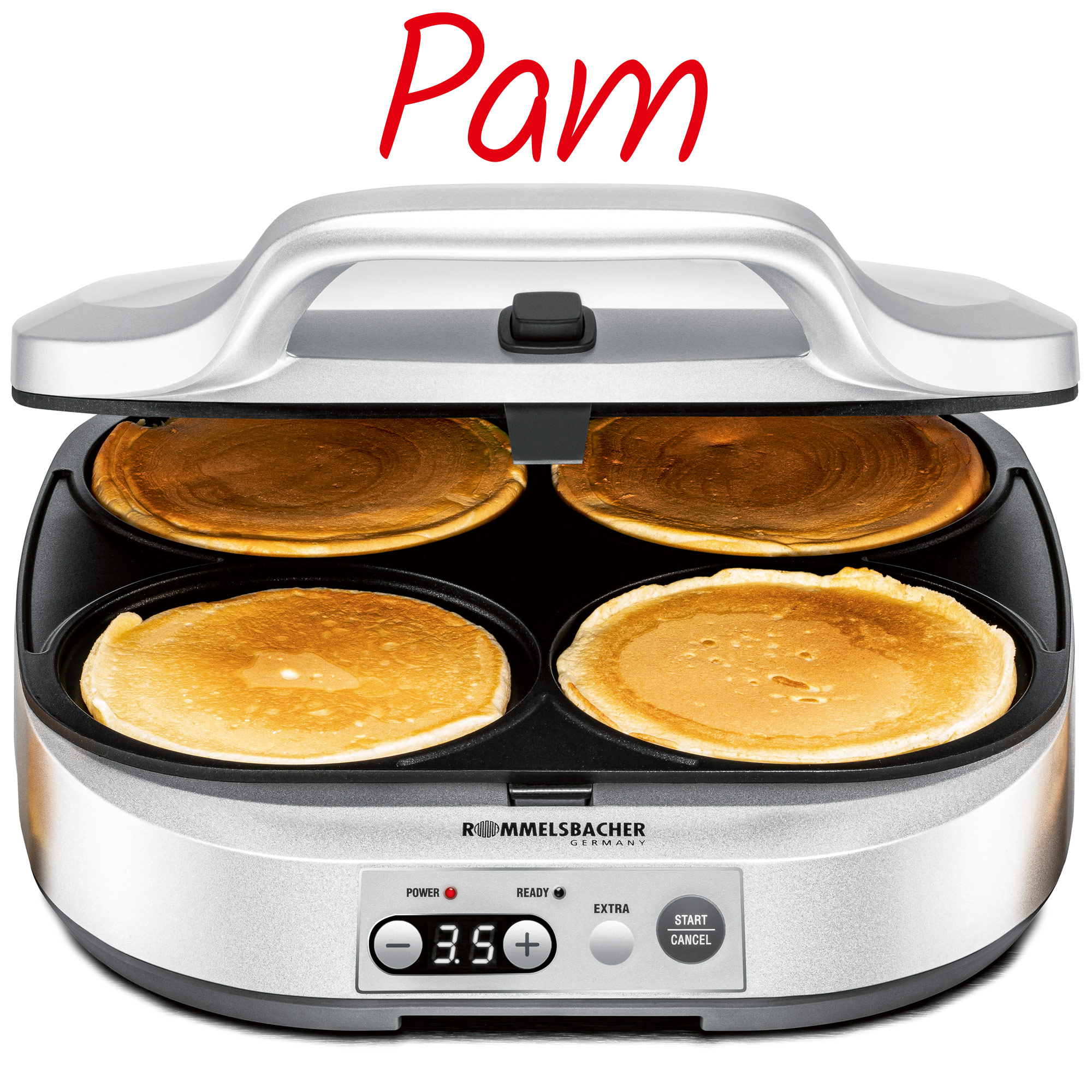 Mit dem vielseitigen Pancake Maker PC 1800 lassen sich zeitgemäße Rezepte und beliebte Klassiker gleich im 4-er Pack backen. American Pancakes zum Frühstück, deftige Kartoffelpuffer zum Mittagessen und am Abend oder bei der Party bäckt ‚Pam‘ herzhafte Burger Patties, die wahlweise aus Fleisch oder vegetarisch/vegan aus Gemüse gemacht sind. Das leistungsstarke Gerät heizt die vier großen, antihaftbeschichteten Backmulden in Minutenschnelle auf. Die Bedienung erfolgt bequem über Soft-Touch Tasten und das LED Display bietet guten Überblick. Die Aludruckguss Platten verteilen die Hitze optimal und sorgen für gleichmäßige Backergebnisse. Eine Zeitschaltuhr erlaubt die Einstellung von individuellen Backzeiten – passend zur Füllung – und die Nachbräun-Funktion erlaubt auf Tastendruck eine noch intensivere Röstung. Für Sicherheit im Gebrauch sorgen die automatische Abschaltung, das Cool Touch Gehäuse, ein Überhitzungsschutz und die rutschfesten Gerätefüße. Die hochwertige Antihaftbeschichtung ermöglicht zudem eine leichte Reinigung, anschließend kann der PC 1800 platzsparend senkrecht im Schrank verstaut werden. Das perfekte Gerät für die zeitgemäße Küche!