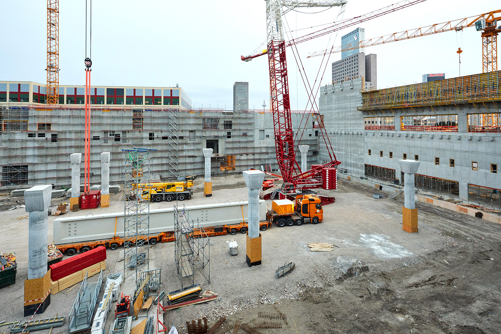 Nachdem eine provisorische Straße in der Baustelle angelegt und ein Raupenkran mit einer Traglast von max. 600 Tonnen aufgestellt worden ist, erfolgte die Anlieferung des ersten Betonbinders für die neue Halle 12. Insgesamt werden 48 Betonbinder, die als Unterzüge für die obere Hallenebene dienen, verbaut. Die Binder haben jeweils ein Gewicht von 105 Tonnen und eine Länge von rund 27 Meter. Diese Schwerlasttransporte sollen bis Ende April abgeschlossen werden.