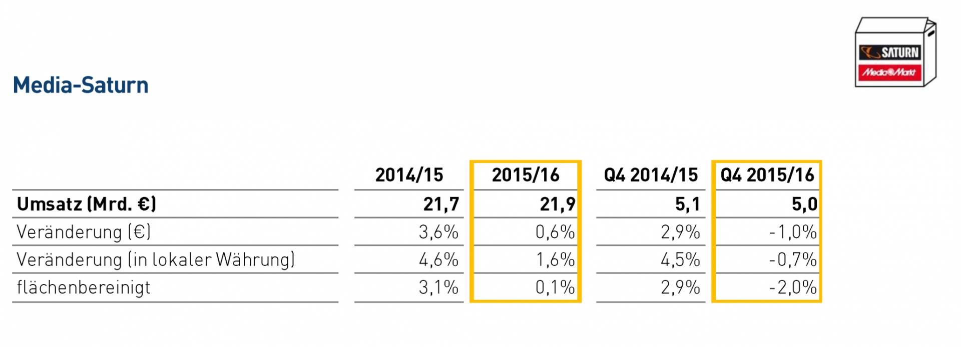 Im 4. Quartal 2015/16 sank der flächenbereinigte Umsatz bei Media-Saturn gegenüber einer zugegeben hohen Vorjahresbasis um 2,0%. Der berichtete Umsatz ging um 1,0% auf 5,0 Mrd. EUR zurück. Während der Umsatz in Deutschland und Westeuropa rückläufig war, konnte der Umsatz in Osteuropa zulegen. Die Volumenmärkte litten unter mehreren negativen Faktoren, unter anderem bedingt durch die Verzögerungen bei der Auslieferung wichtiger Produkte. Hinzu kamen die negativen Umkehreffekte aus den starken Verkäufen neuer Fernsehgeräte im Rahmen der Fußball-Europameisterschaft im 3. Quartal 2015/16. Auch das rückläufige Geschäft bei Redcoon hat maßgeblich zu den sinkenden Umsätzen im 4. Quartal beigetragen.