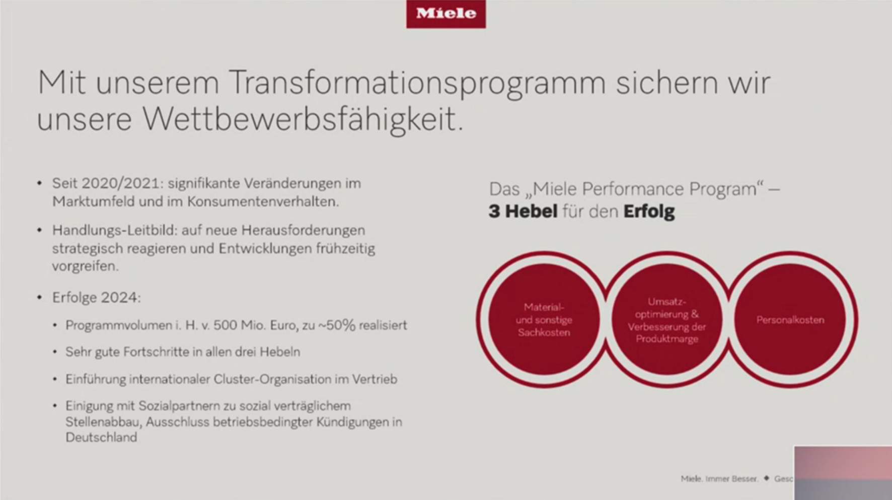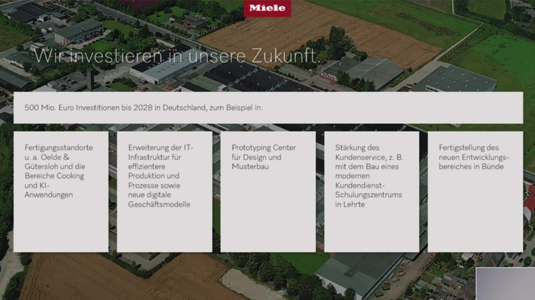 Im Rahmen des 2024 gestarteten Transformationsprogramms MPP (Miele Performance Program) hat Miele nach eigenen Angaben wichtige Meilensteine erreicht. Miele plant, bis 2028 rund 500 Millionen Euro in Deutschland zu investieren. Dazu gehören u.a. Investitionen in die Standorte Oelde und Gütersloh sowie die Bereiche Cooking und KI-Anwendungen sowie eine weitere Stärkung des Kundenservice.