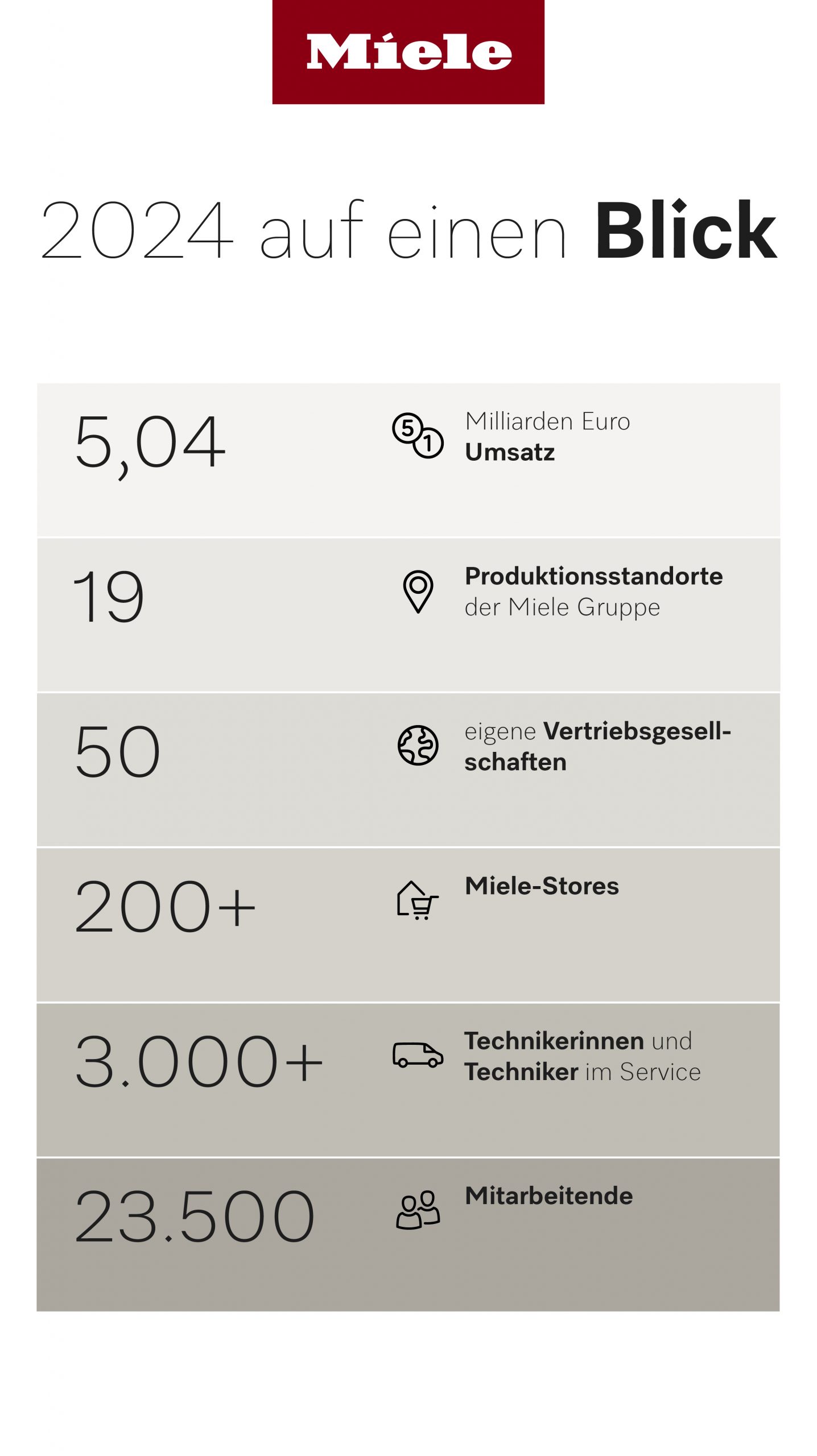 Auch wenn die Rahmenbedingungen durch die anhaltende Baukrise, Konsumzurückhaltung, intensiven Wettbewerb sowie geopolitische Entwicklungen herausfordernd bleiben, sieht Miele positive Anzeichen für das laufende Geschäftsjahr. Das ist kein Kaffeesatzlesen, sondern eine Einschätzung, die auf der Geschäftsentwicklung zum Jahresauftakt und dem Feedback des Handels zu Produktneuheiten fußt. Zinkann: „Wir setzen unseren strategischen Kurs unbeirrt fort, um unsere Ziele nachhaltig zu erreichen. Auf das Geschäftsjahr 2025 blicken wir zuversichtlich.“