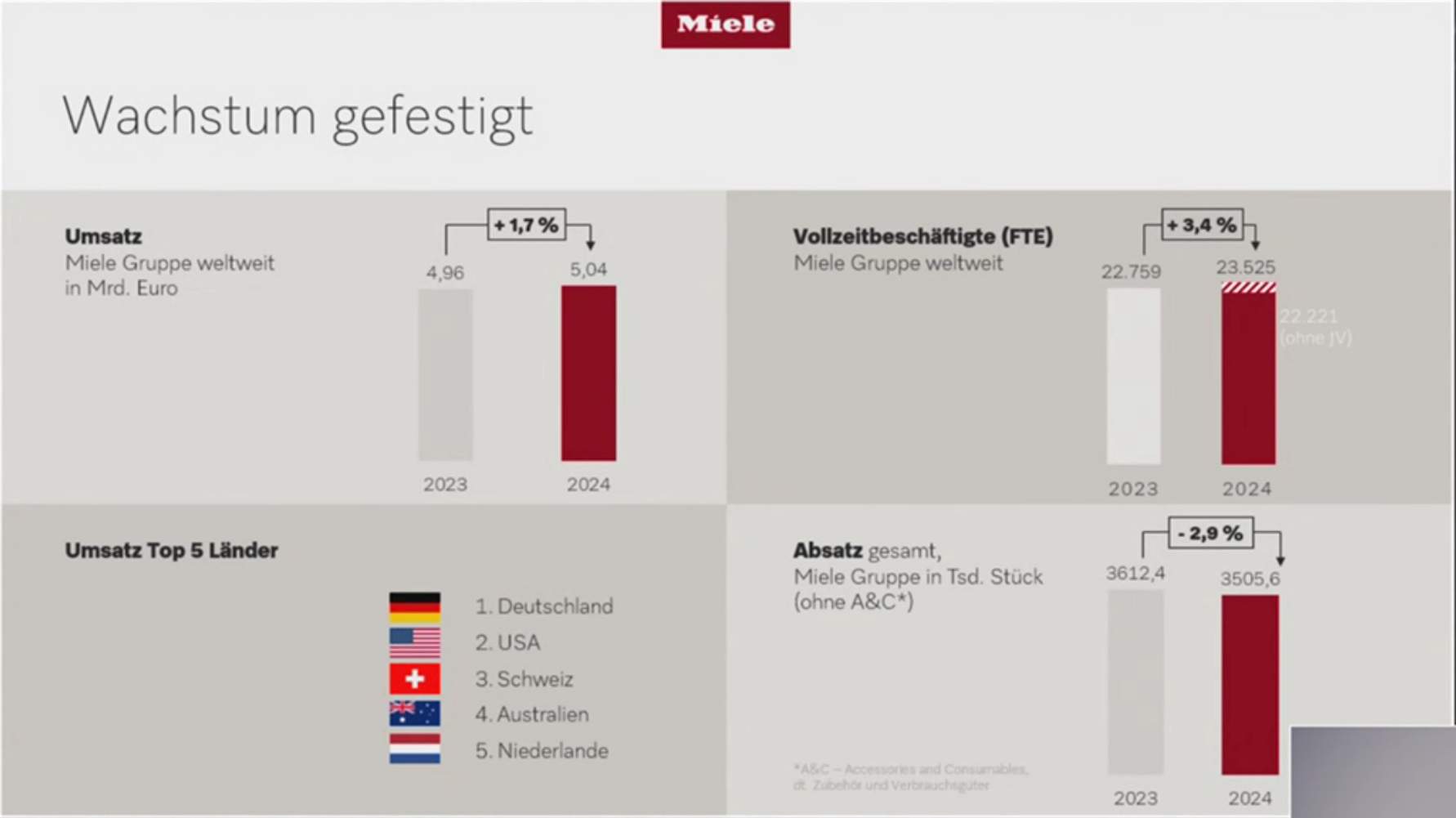 Und gute Nachrichten gibt es aus der Miele Gruppe allemal, selbst wenn das Deutschland-Geschäft auch weiterhin noch schwächelt. Miele hat das Geschäftsjahr 2024 – auch dank eines Einspar- und Transformationsprogramms – mit einem Umsatzplus abgeschlossen.