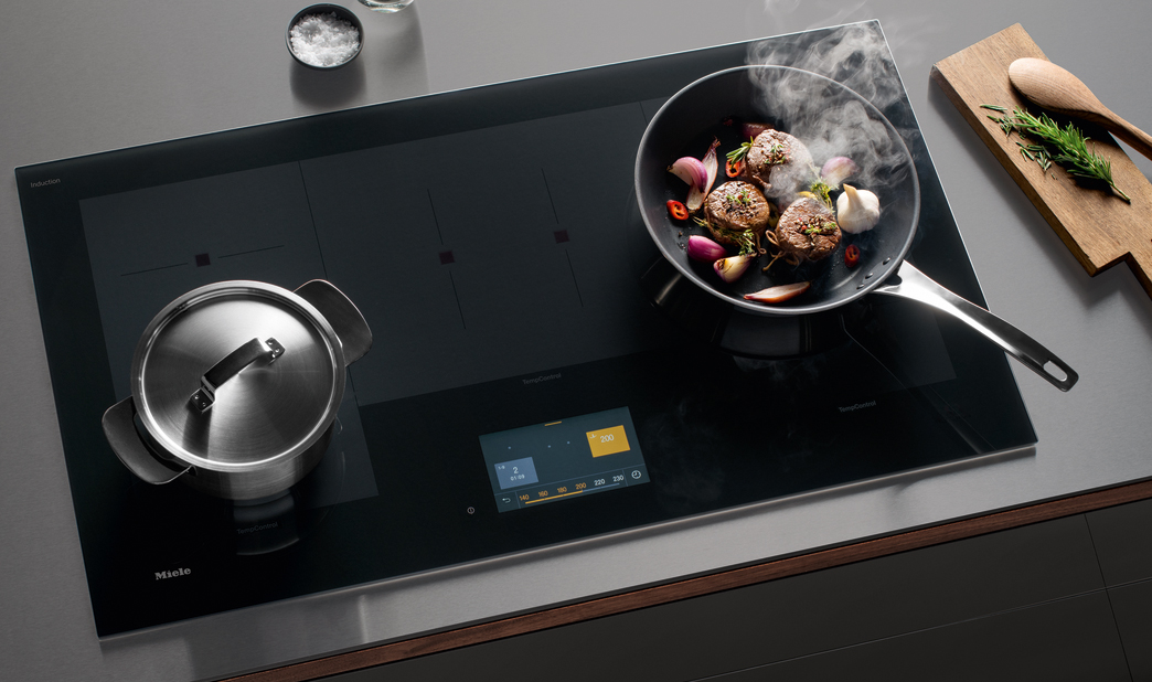 Das Miele Induktionskochfeld KM 7999 verfügt über drei PowerFlex-Bereiche für variables Kochen mit bis zu fünf Töpfen und Pfannen. Es wird über ein integriertes sieben Zoll großes TFT-Farbdisplay gesteuert und bietet 23 Assistenzprogramme.