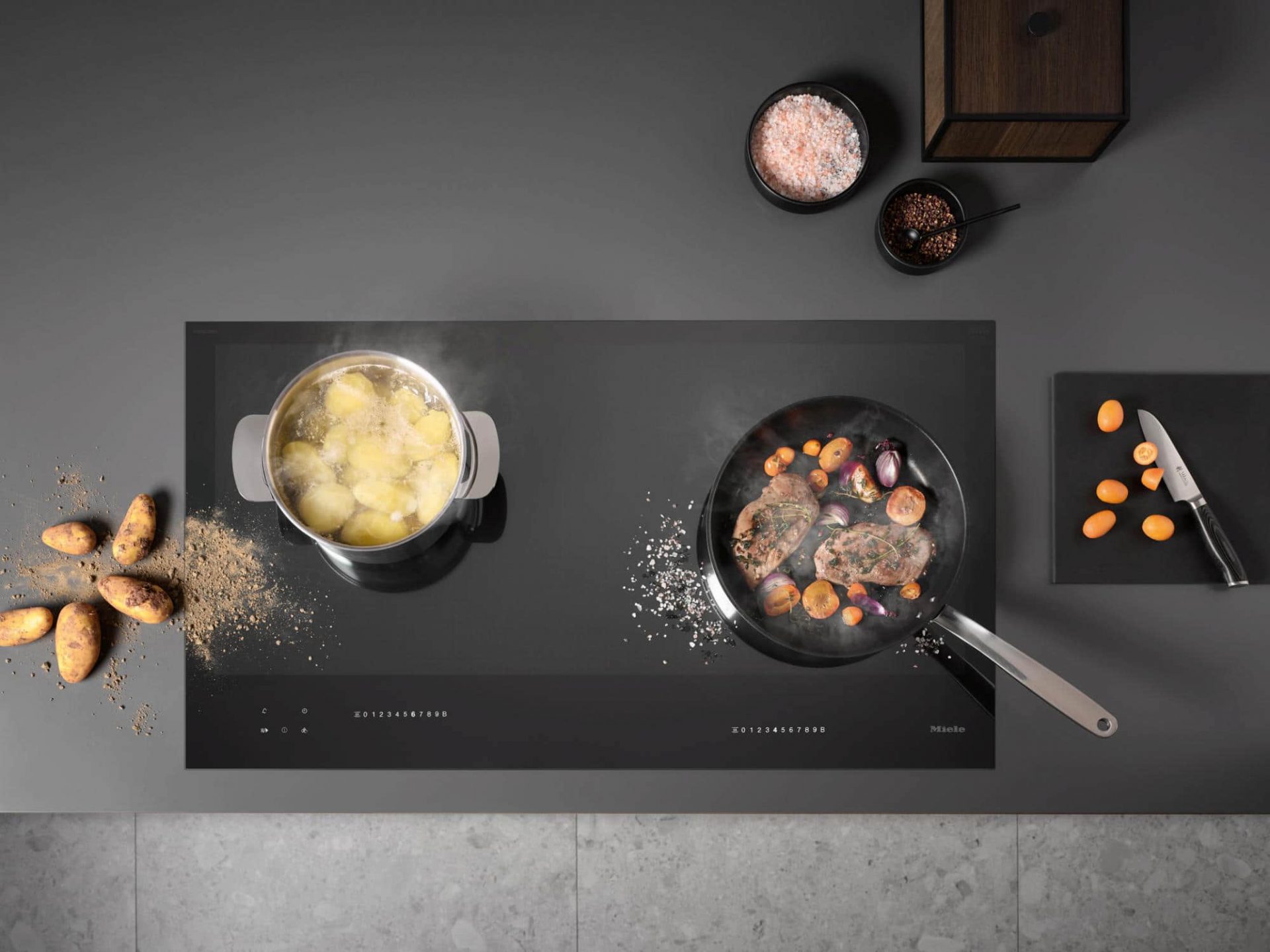 Ebenfalls mit dem iF und dem Red Dot Designpreis ausgezeichnet wurde das Vollflächen-Induktionskochfeld KM 7897-1 FL Diamond. Bis zu sechs Töpfe, Pfannen und Bräter können beliebig auf dem 90 Zentimeter breiten Kochfeld platziert und verschoben werden. Zudem ist das Kochfeld mit einer speziellen Beschichtung der Glaskeramik ausgestattet. Der Red Dot Jury gefiel das elegant dezente Erscheinungsbild: „Ist das rahmenlose Kochfeld nicht in Betrieb, sind die Bedienelemente unsichtbar. So ergibt sich ein ruhiges, homogenes Erscheinungsbild.“ Die iF-Prüfkommission hebt den dezenten Glanz hervor, der den Kochfeldern zusätzliche Eleganz verleiht.