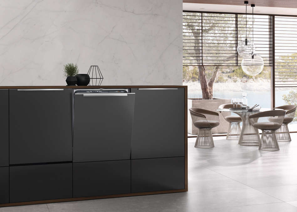 Dank einer integrierten Mechanik gleitet beim Öffnen des Geschirrspülers die Möbelfront leicht nach oben. Dadurch wird für die einschwenkende Tür weniger Raum unterhalb des Spülers benötigt – und im Design ein darunterliegendes Spaltmaß von nur wenigen Millimetern sowie eine besonders niedrige Sockelhöhe ermöglicht.