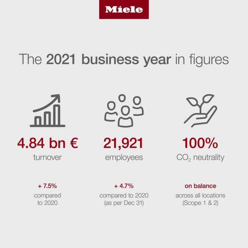 Miele setzt deutliche Zeichen für ein nachhaltiges Wachstum: So hat die Miele Gruppe im Geschäftsjahr 2021 weltweit 4,84 Mrd. EUR Umsatz erzielt – das sind 7,5% mehr als im Jahr zuvor. Mit seinen energieeffizienten Geräten, dem Einstieg in die Verarbeitung von grünem Stahl sowie CO₂-Neutralität an den Standorten verstärkt Miele zugleich seine Anstrengungen in Richtung der Pariser Klimaziele weiter.