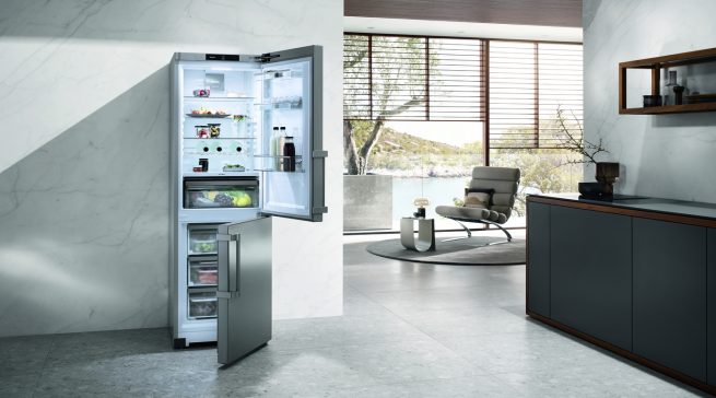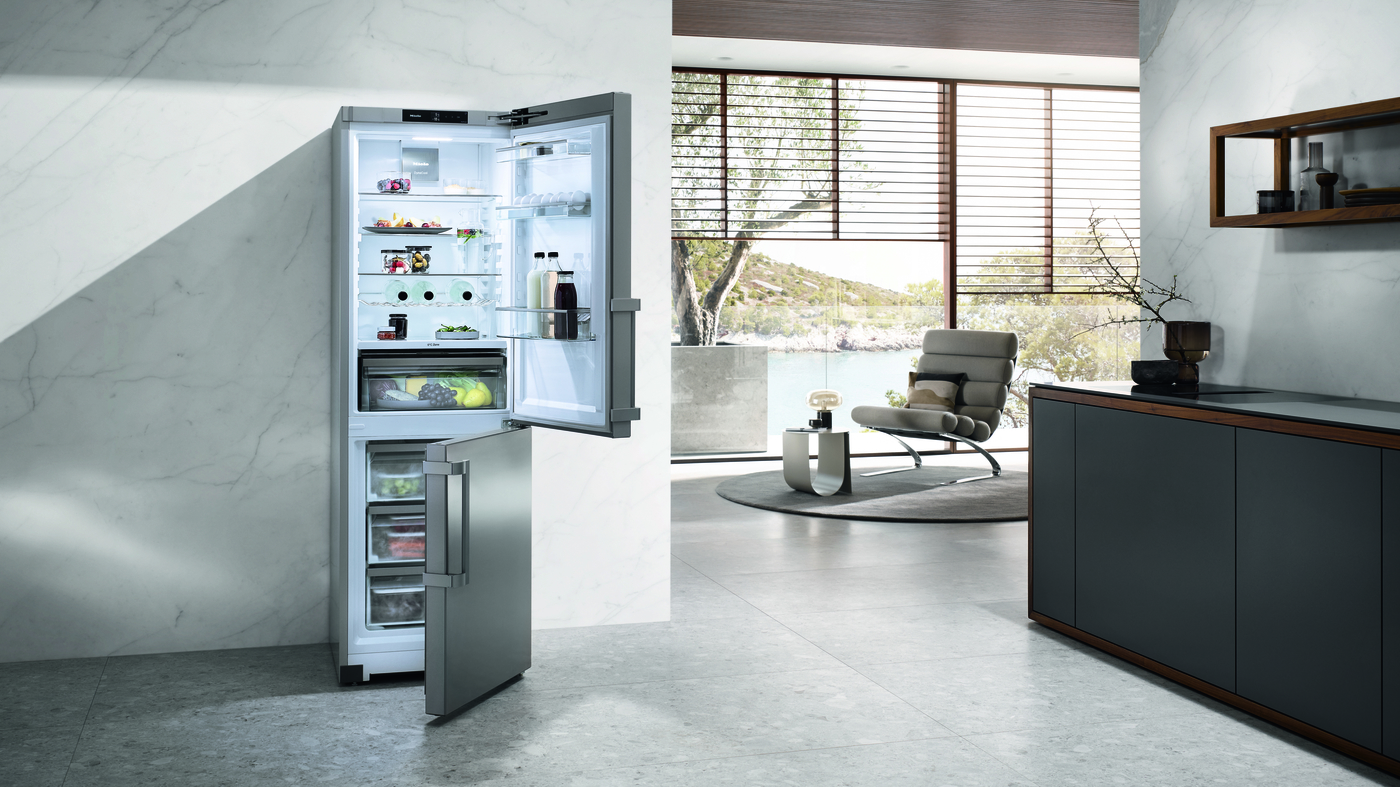 Einen Beitrag für weniger Lebensmittelverschwendung leisten zum Beispiel die neuen Standkühlgeräte der Generation K 4000 mit ihrem Frischesystem PerfectFresh Active – bei dem das Zusammenspiel einer Temperatur um die null Grad mit Feuchtigkeit sowie einem feinen Wassernebel das Gemüse und Obst bis zu fünfmal länger knackig frisch und ansehnlich hält.
