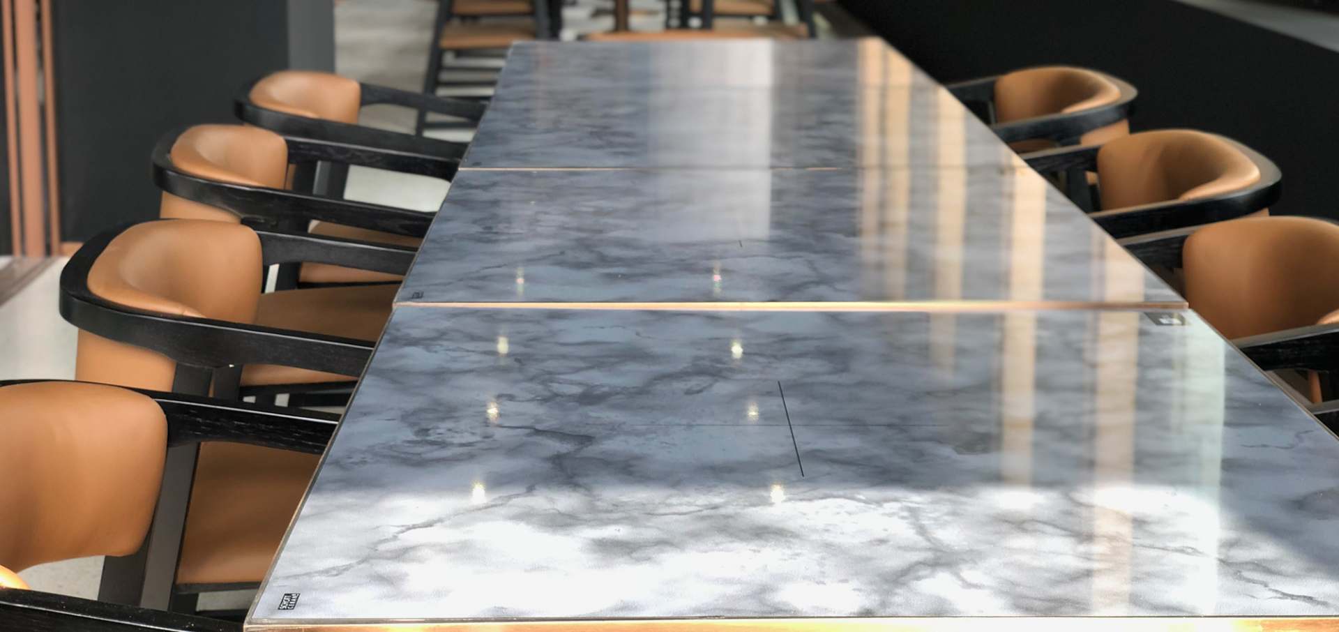 Der Miji Kochtisch bietet ein ganz besonderes Kocherlebnis in der Gastronomie. Der Tisch ist in hochwertiger Marmoroptik aus Original Schott Ceran gefertigt.