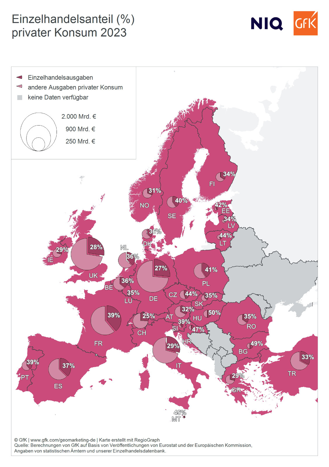 Die höchsten Anteile gibt es in Ungarn, wo jeder zweite Euro in den Einzelhandel fließt. Das sind aktuelle Ergebnisse, die GfK in einer neuen, kostenfreien Studie zum Einzelhandel in Europa veröffentlicht.
