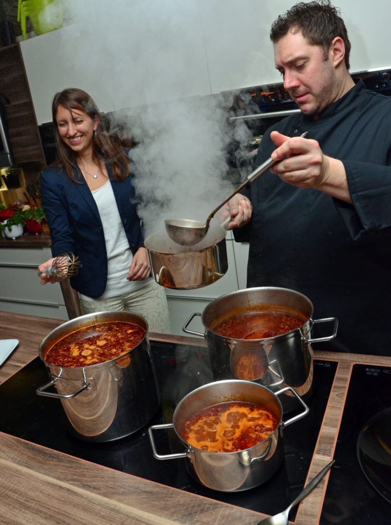Derzeit besonders angesagt sind Kochkurse für Veganer. „Das hat sich zu einem echten Trend entwickelt“, sagt Reeh. Aber auch die Klassiker wie Fleisch- , Fisch- und Pasta-Kochkurse sind stets gut gebucht. Trend Nummer zwei sind Kochkurse, bei denen die Stars aus der Region in den Topf und auf die Teller kommen. „Heimat auf der Zunge“ – das lassen sich immer mehr Menschen schmecken und suchen nach immer neuen Rezepten und Bezugsquellen. Doch der absolute Renner ist das Thema Kochen mit Handkäs‘. In Reehs Kochschule können sich Fans dieser hessischen Spezialität nach Herzenslust austoben. Ob Handkäs‘-Carpaccio, Handkäs‘ im Mantel, Handkäs‘ Mousse, Tiramisu mit Handkäs‘ oder Praline vom Handkäs‘ – Reeh kennt viele Rezepte und gibt sie gerne an seine Kursteilnehmer weiter. Ganz neu im Programm sind Kochkurse mit Gesang – von und mit Mirko Reeh. Sie starten am 24. Oktober.