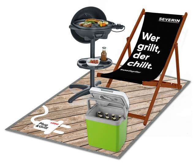 Das ansprechende Deko-Set, bestehend aus einem Liegestuhl und Floorgraphic, inszeniert eine sommerliche Balkonsituation und ist nach individueller Absprache kostenlos für den Händler erhältlich. Das Deko-Set kann auch nach dem Aktionszeitraum produktunabhängig den ganzen Sommer über präsent am POS für jeden Grill von Severin eingesetzt werden.