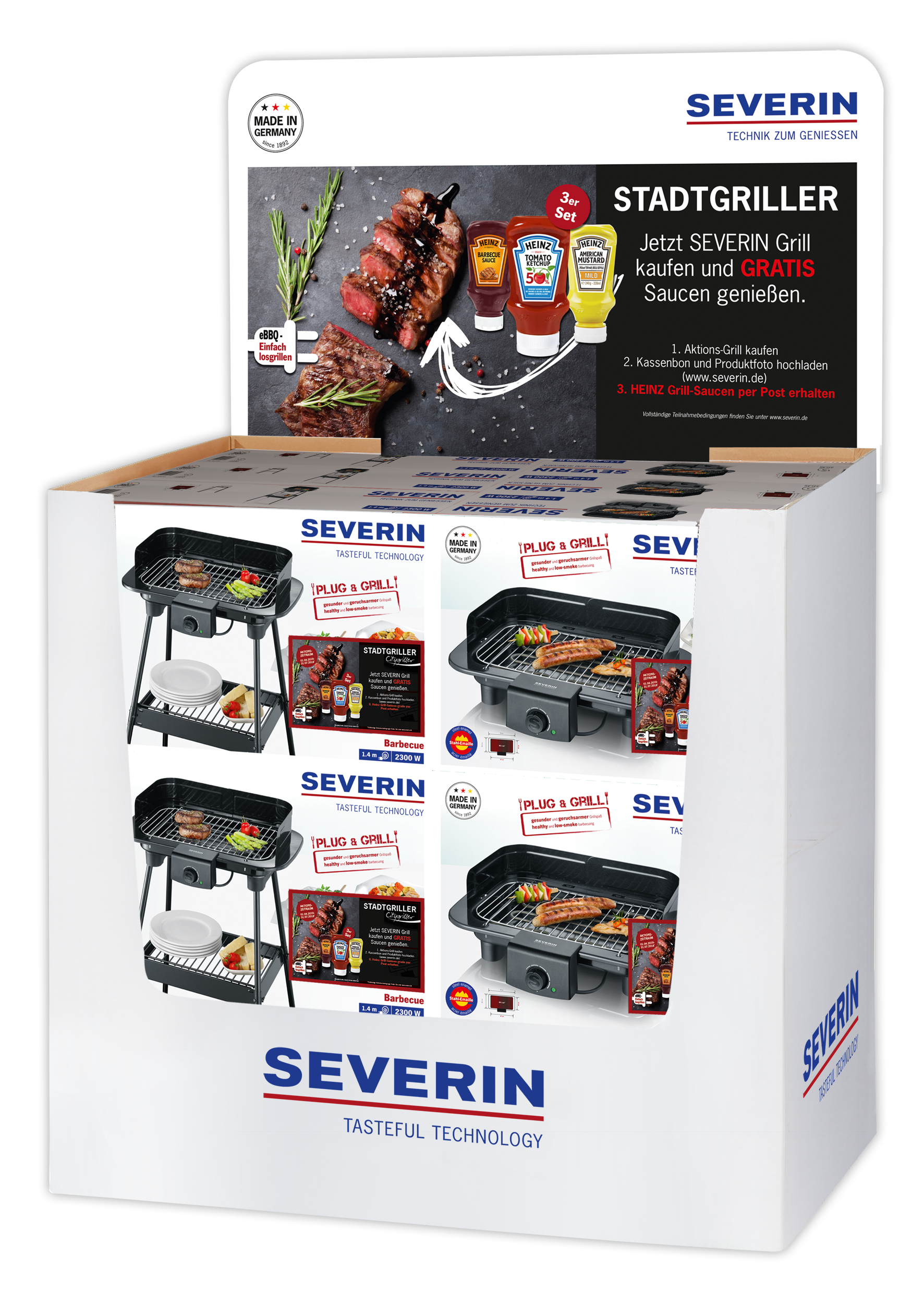 Zum Auftakt der Grill-Saison sorgt SEVERIN für einen zusätzlichen Kaufanreiz: Kauft der Endverbraucher einen der fünf ausgewählten Elektrogrills, so erhält er gratis drei leckere Grillsoßen der Marke Heinz direkt nach Hause. Die Mechanik „Buy & Get“ ist denkbar einfach: Aktionsgrill kaufen, Kassenbon und Produktfoto online hochladen und Grill-Saucen gratis nach Hause bekommen.