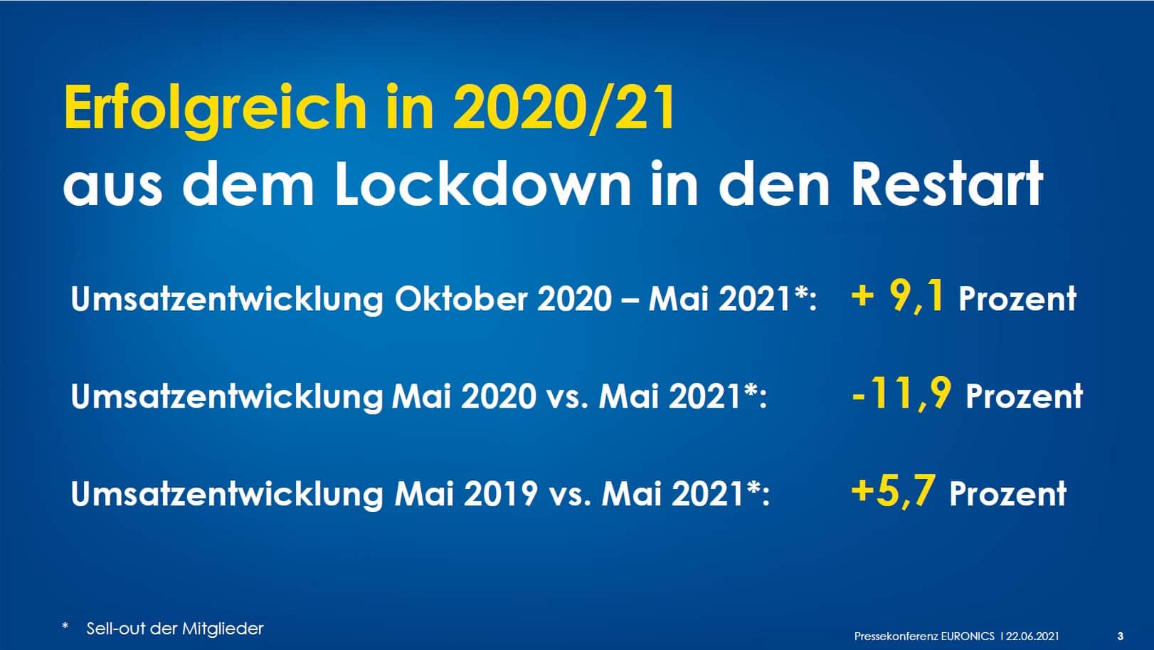 Für Kober wird das Jahr 2021 mit Blick auf den Umsatz ein vernünftiges Jahr. Aber: „Ab 2022 wird die Arbeit deutlich zunehmen, um vergleichbare Ergebnisse zu erzielen.“ Apropos vergleichbar: Vergleicht man die Euronics-Umsatzentwicklung aus dem Vor-Corona-Mai 2019 mit 2021, steht ein Plus von 5,7% zu Buche.
