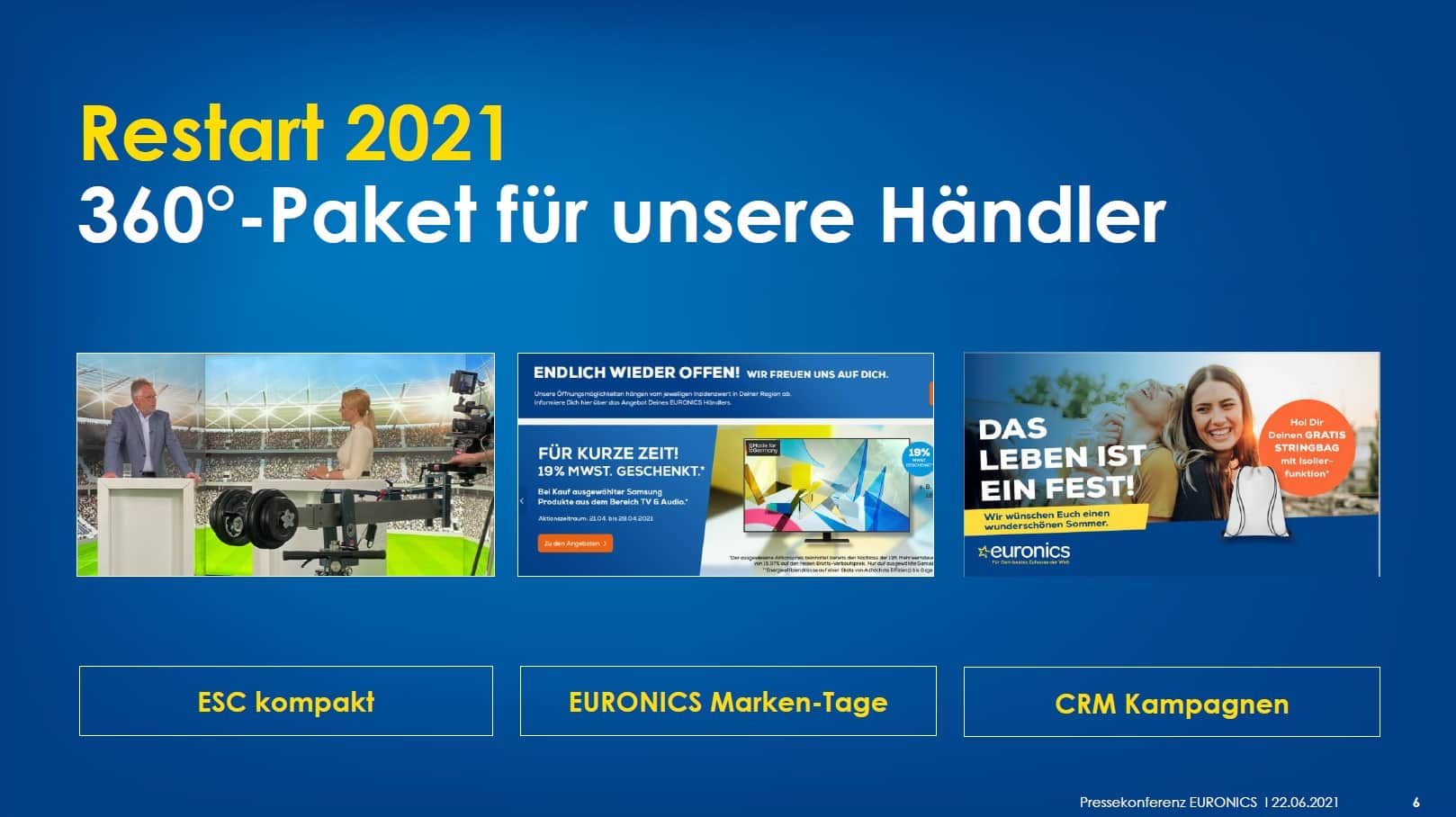 Was bringt für Euronics die zweite Jahreshälfte 2021 bzw. der Start ins neue Geschäftsjahr 2021/22 ab 1. Oktober? Erste Antworten darauf gab das digitale Format „ESC kompakt“ mit 44 ESC-Deals (die georderten Drucker gingen in rekordverdächtigen 40 Sekunden an die Händler) und 75 Beiträgen aus der Industrie. Kober: „Wir gehen auch ohne IFA mit Volldampf in das 2. Halbjahr mit einem ‚Restart 360 Grad Paket‘ für unsere Händler.“ Das beinhaltet neben dem Format „ESC kompakt“ u.a. die Euronics Marken-Tage sowie CRM-Kampagnen wie „Das Leben ist ein Fest“. Für den Oktober ist zudem ein „KickOff22 mit Vollgas ins neue Geschäftsjahr“ auf Mallorca geplant.