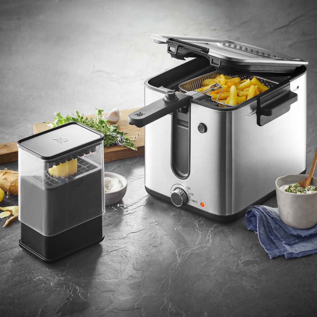 BBQ bei WMF bedeutet nicht nur die Zubereitung von Fleisch und Fisch, sondern umfasst auch Gerichte aus oder mit Gemüse, Käse, Salaten und vielem mehr. Dadurch wird Grillen zu einer der individuellsten Zubereitungsarten – denn jede(r) kann selbst entscheiden, was auf den Grill kommt, passend zu (Genuss-)Stimmung des Tages. Eine perfekte Ergänzung zu den drei neuen Elektroprodukten aus dem Grill-Segment ist die WMF KÜCHENminis Fritteuse & Kartoffel-Schneider, schließlich sind klassische Pommes frites eine beliebte Beilage bei diversen Social Dining Gerichten. Die außergewöhnliche Kombination aus Fritteuse und dazu passendem Kartoffel-Schneider sorgt als Dream-Team dafür, dass hausgemachte Pommes frites zuerst gleichmäßig geschnitten und danach knusprig zubereitet werden können.