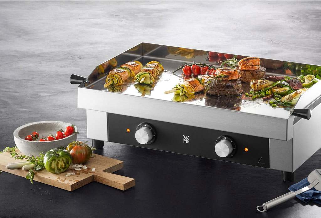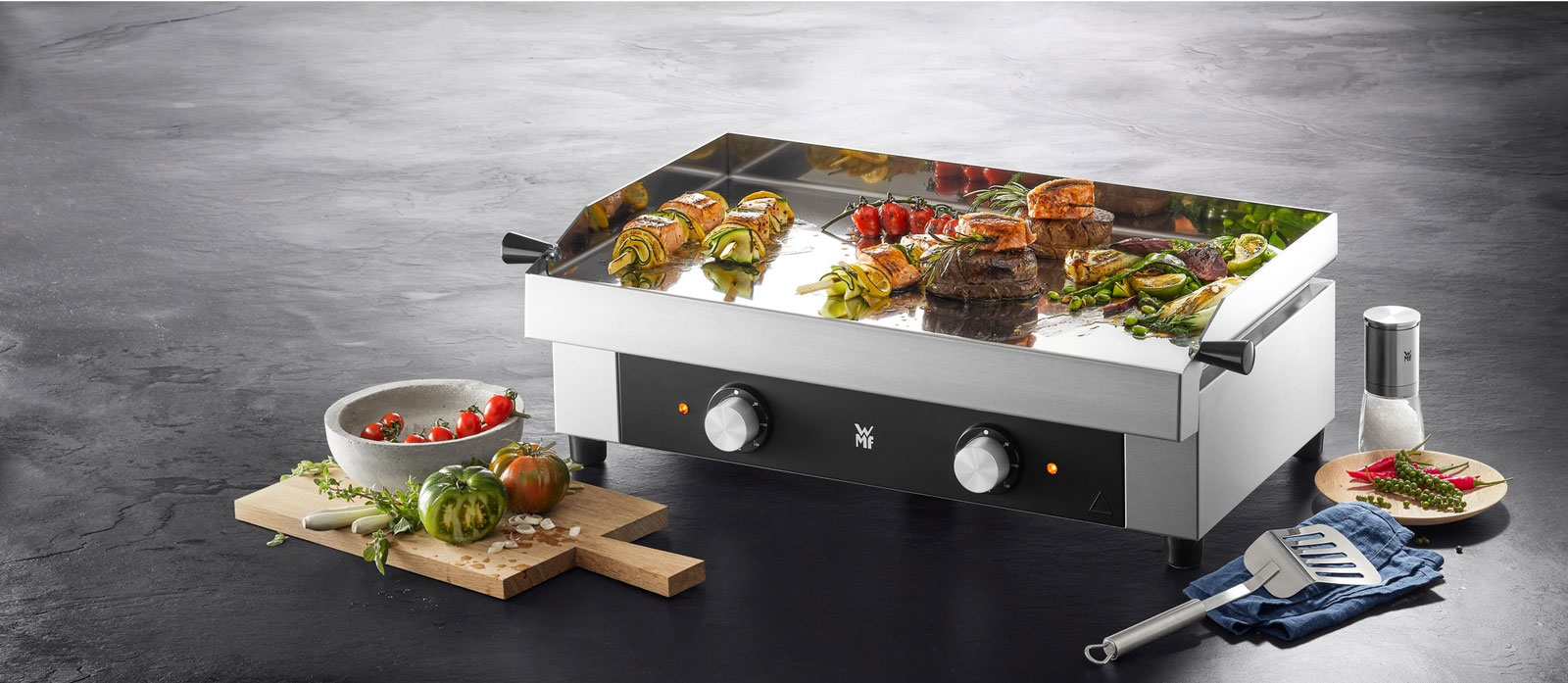 Mit dem WMF Profi Plus Plancha Grill wird ein neues Level an vielseitigen Grillmöglichkeiten erreicht. Von leckeren spanischen Plancha-Rezepten bis hin zum köstlichen japanischen Teppanyaki – der Plancha Grill sorgt stets für hervorragende Ergebnisse. Dem WMF-eigenen Anspruch folgend, hält auch dieses Gerät höchste Sicherheitsstandards ein und ist zudem für den Außeneinsatz zertifiziert. (erhältlich ab Juni)