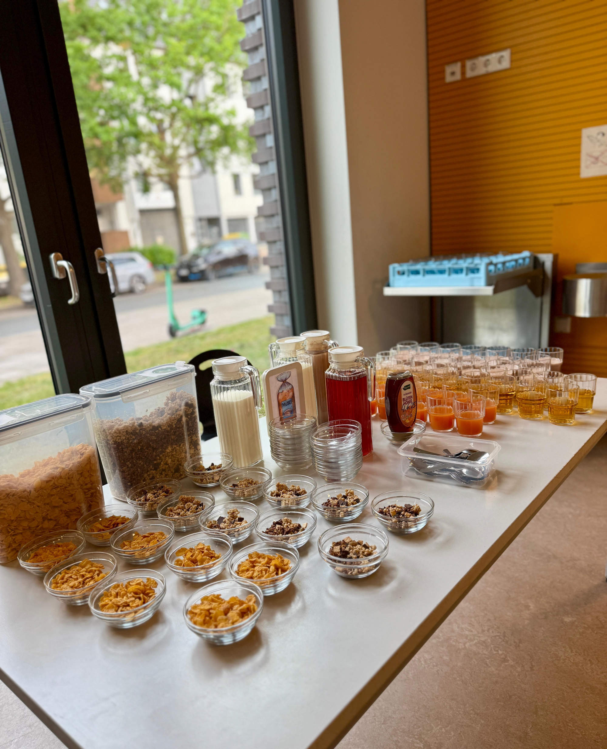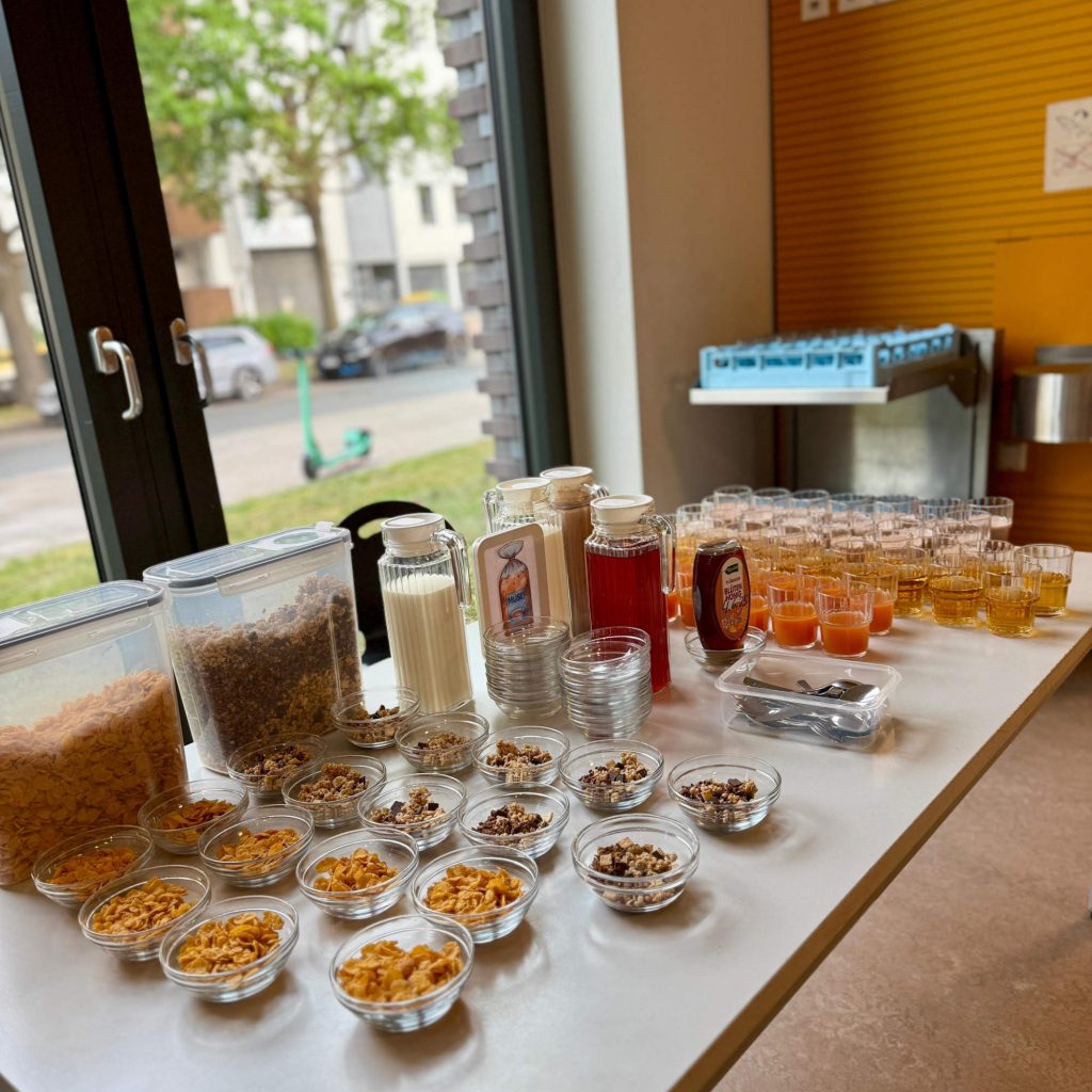 Wie diese Hilfe konkret aussieht, erfuhren die Konzeptverantwortlichen nun aus erster Hand. In der Mensa der Fichteschule in Hannover, einer Grundschule mit rund 300 Kindern, unterstützten sie das ehrenamtliche Helferteam beim morgendlichen Frühstücksservice. Etwa 80 Schülerinnen und Schüler nahmen das Angebot an diesem Tag wahr.