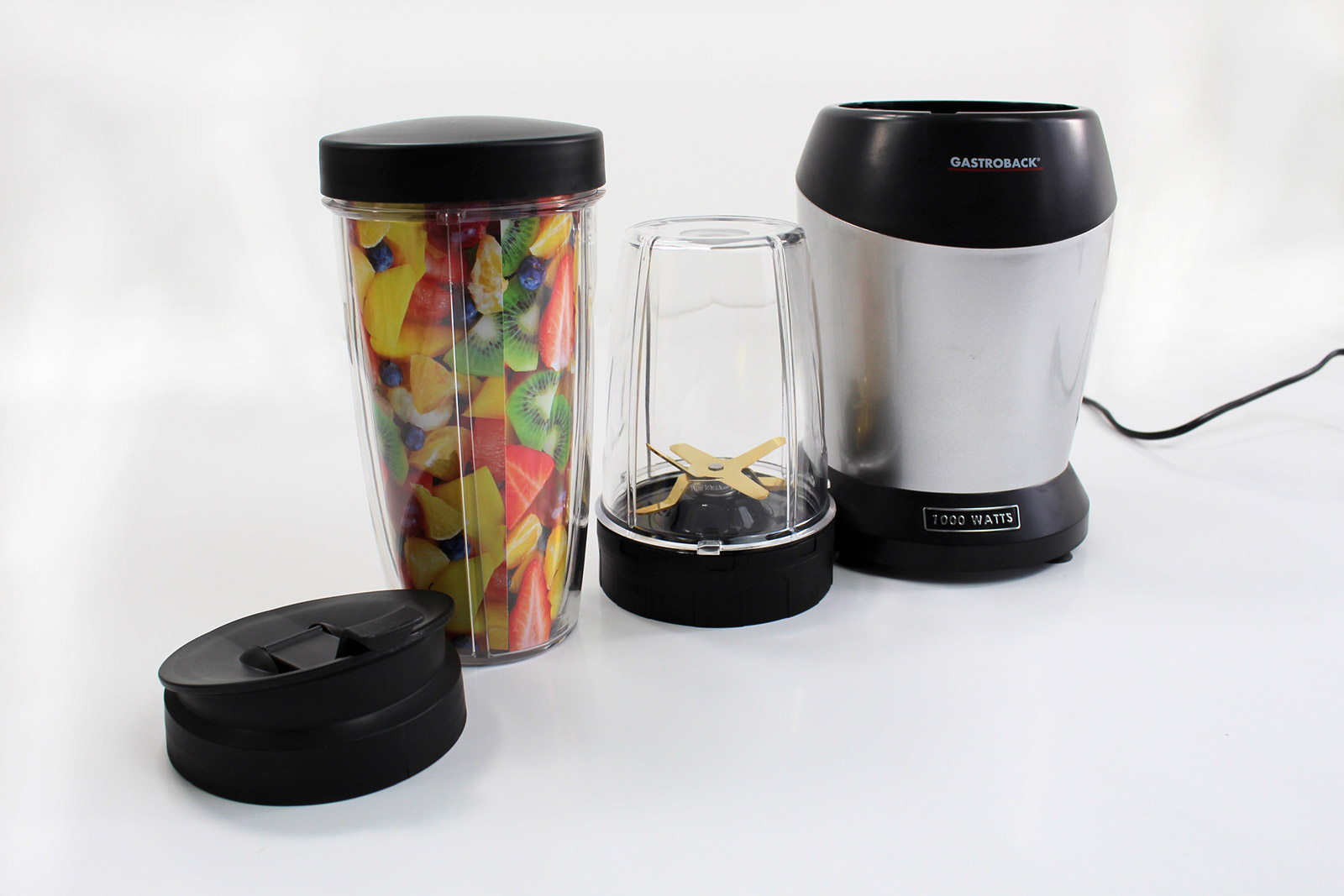 Auf den ersten Blick finde ich den Gastroback Design Micro Blender etwas altbacken und sonderbarerweise sieht es auch nicht so hochwertig aus. Der zweite Blick ändert dieses Bild dann aber total, der Blender in Edelstahldesign gepaart mit den matten schwarzen Flächen ist sehr gut verarbeitet und durch das fehlende Bedienelement sehr puristisch. Die Behälter machen auch einen guten Eindruck und nichts riecht nach Plastik.