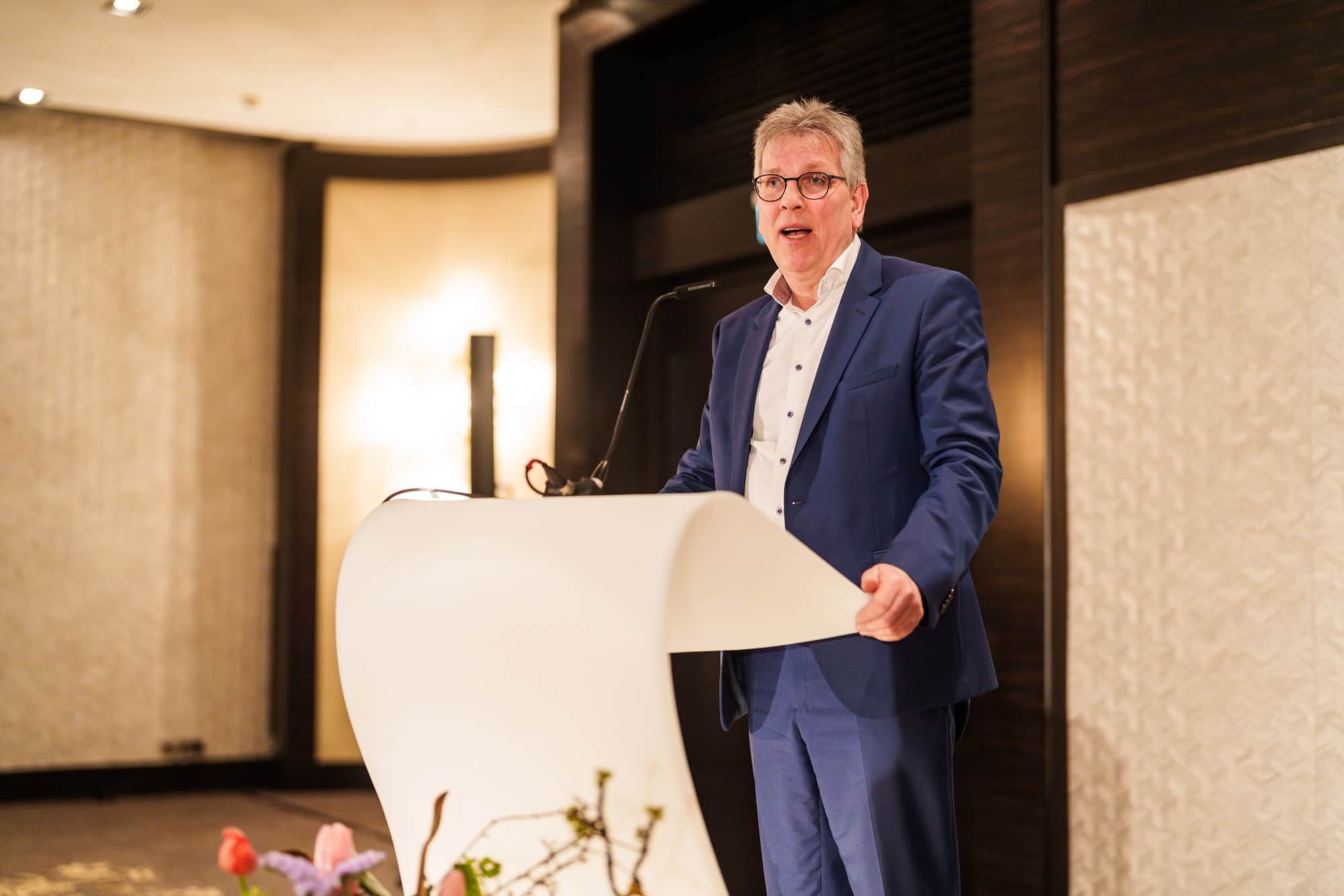 Michael Radau, Präsident des Handelsverbandes Nordrhein-Westfalen, zur Mobilitätswende anlässlich des Jahresempfangs der Handelsverbände in Düsseldorf am 15. März 2023.