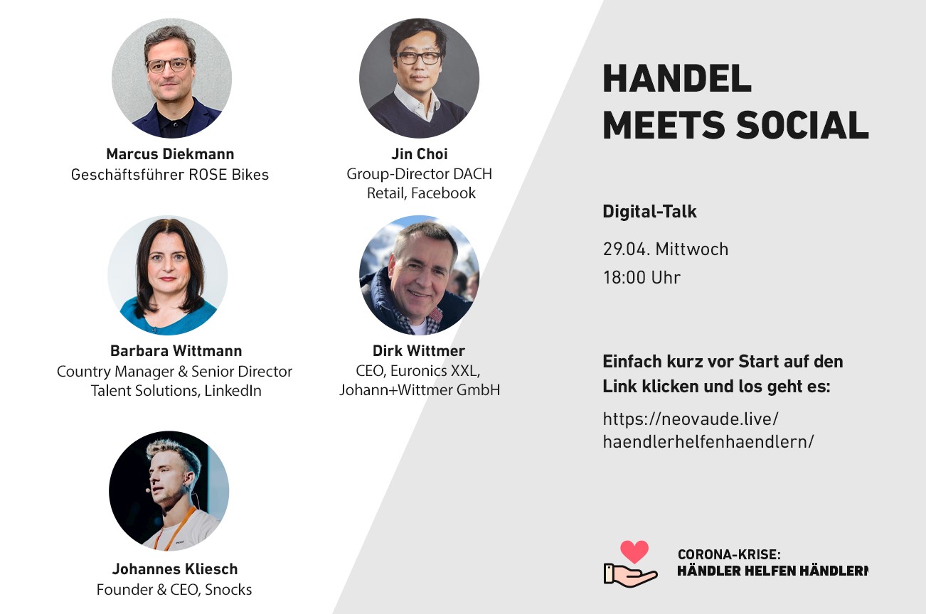 Über das hochaktuelle Thema „Handel meets Social“ diskutieren morgen Abend (Mittwoch 29. April um 18 Uhr) Jin Choi (Group Manager DACH Retail, Facebook), Barbara Wittmann (Country Manager LinkedIn), Johannes Kliesch, Founder & CEO Snocks) sowie mit Dirk Wittmer (CEO Euronics XXL, Johann+Wittmer, Ratingen) erstmals auch ein Gast aus unserer Branche. Gastgeber ist wie bewährt Marcus Diekmann (CEO Rose Bikes und Initiator von „Händler helfen Händlern“).