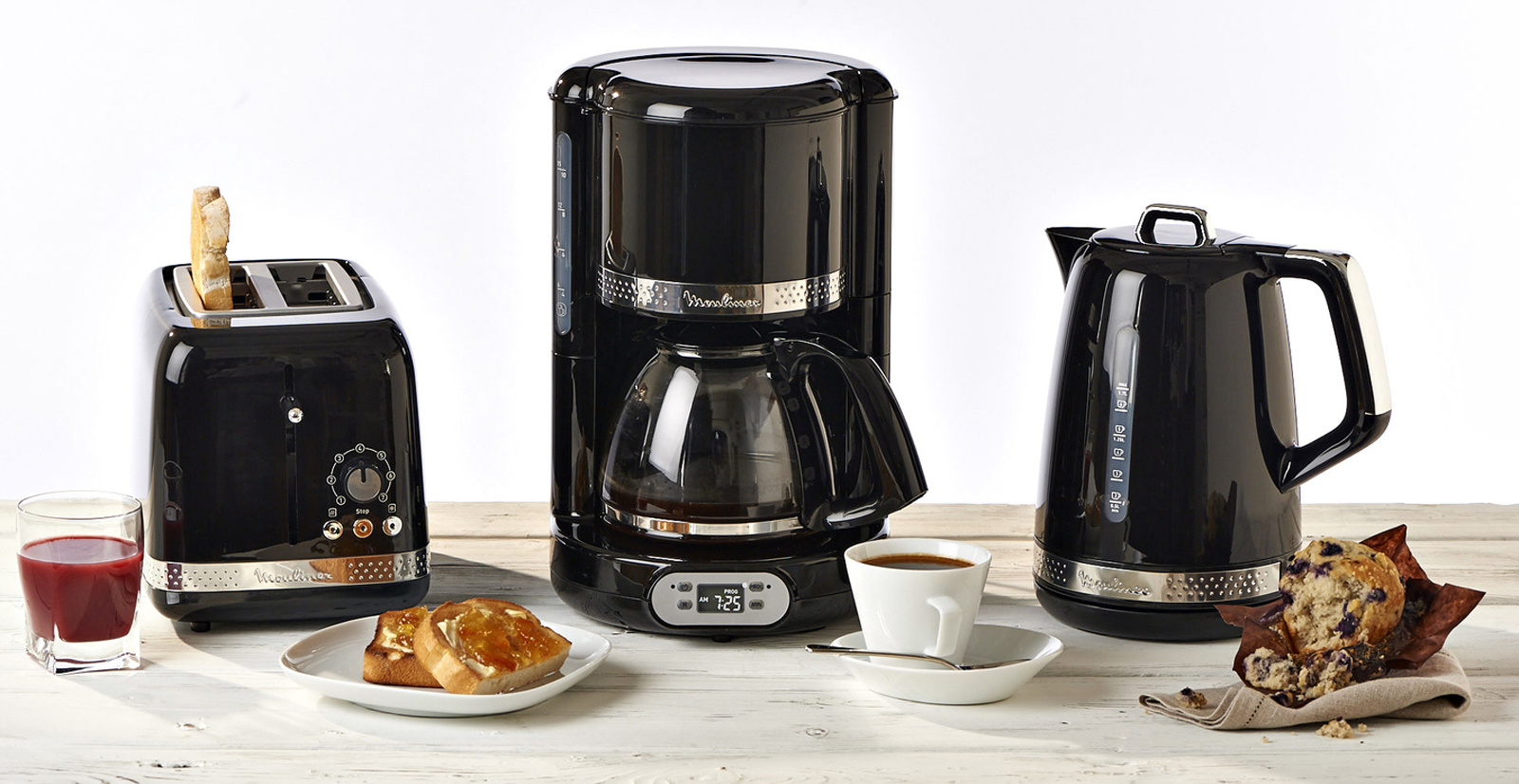 Die Moulinex Frühstücksserie Soleil besteht aus einem dreiteiligen Frühstücksset mit Filterkaffeemaschine, Toaster und Wasserkocher.