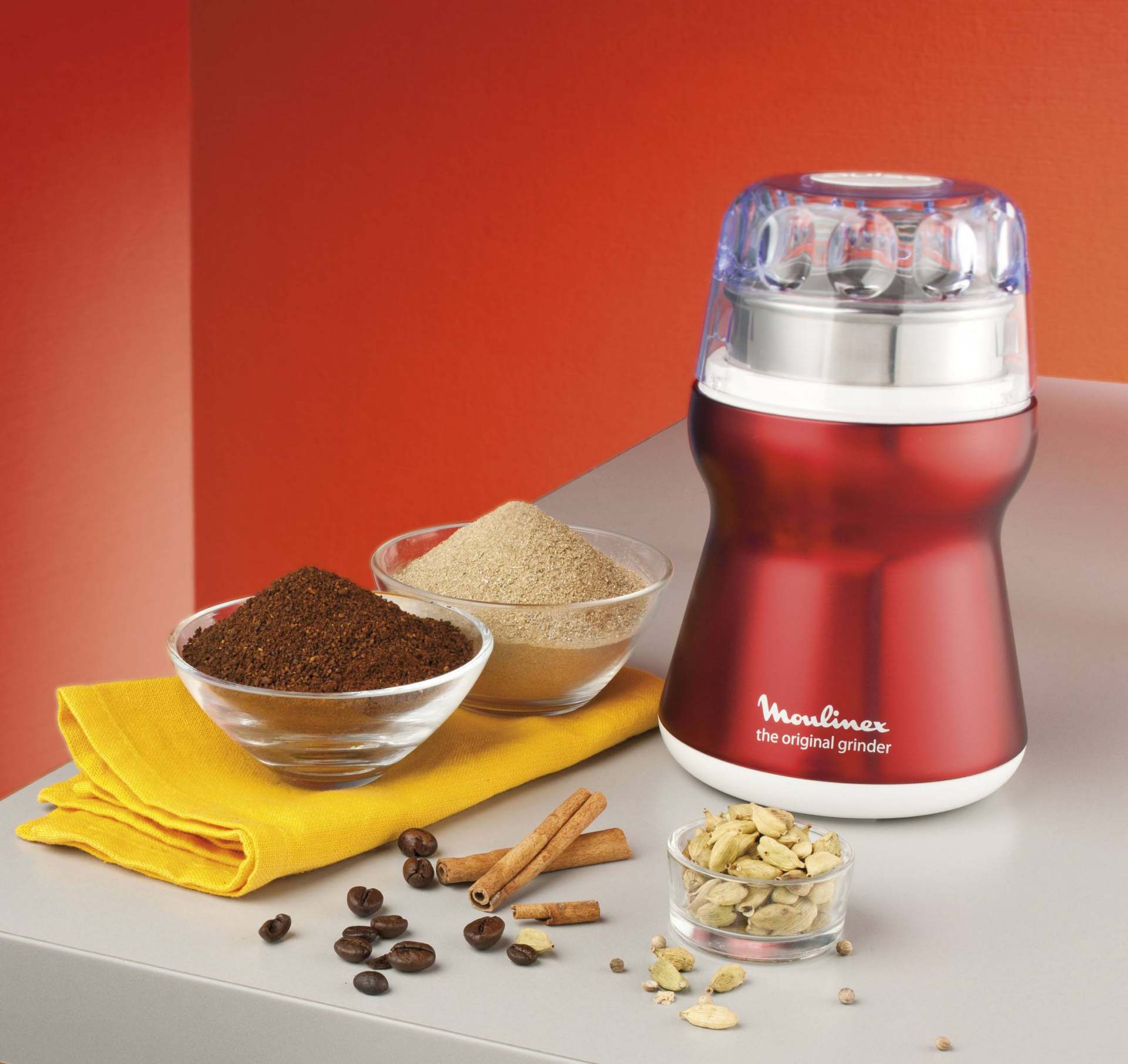 Mit der Moulinex Kaffeemühle Die Originale aus der Red Ruby Collection lebt der Mythos der Marke Moulinex in Deutschland endlich wieder auf. In nur wenigen Sekunden mahlt der kleine Helfer nicht nur Kaffee, auch verschiedenste Gewürze oder Mohn. Nach dem 1-2-3 Prinzip – einfach drei Mal auf dem Deckel drücken – verarbeitet "Die Originale" den Inhalt kinderleicht. Der Behälter der Mühle ist für die leichte Reinigung herausnehmbar und aus Edelstahl. Farben, Geschmack oder Gerüche bleiben so nicht am Gerät haften.