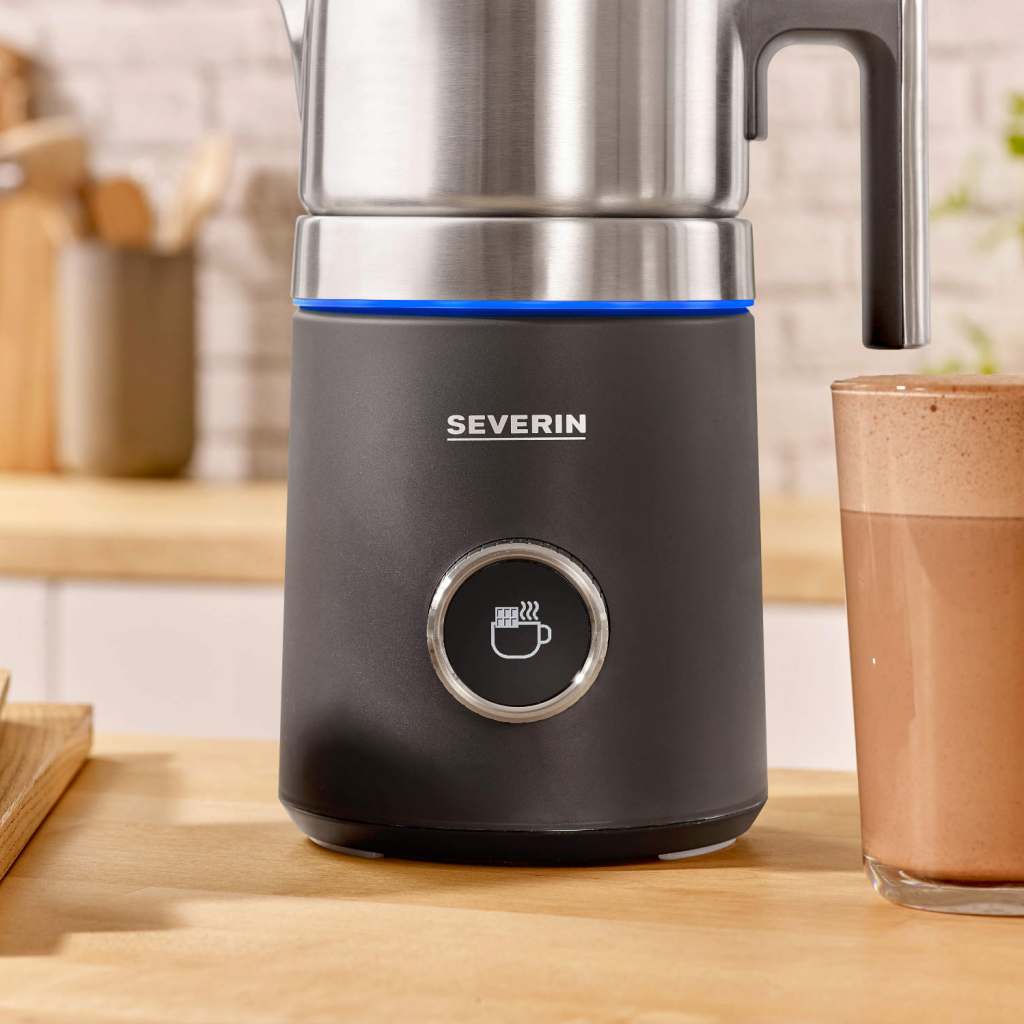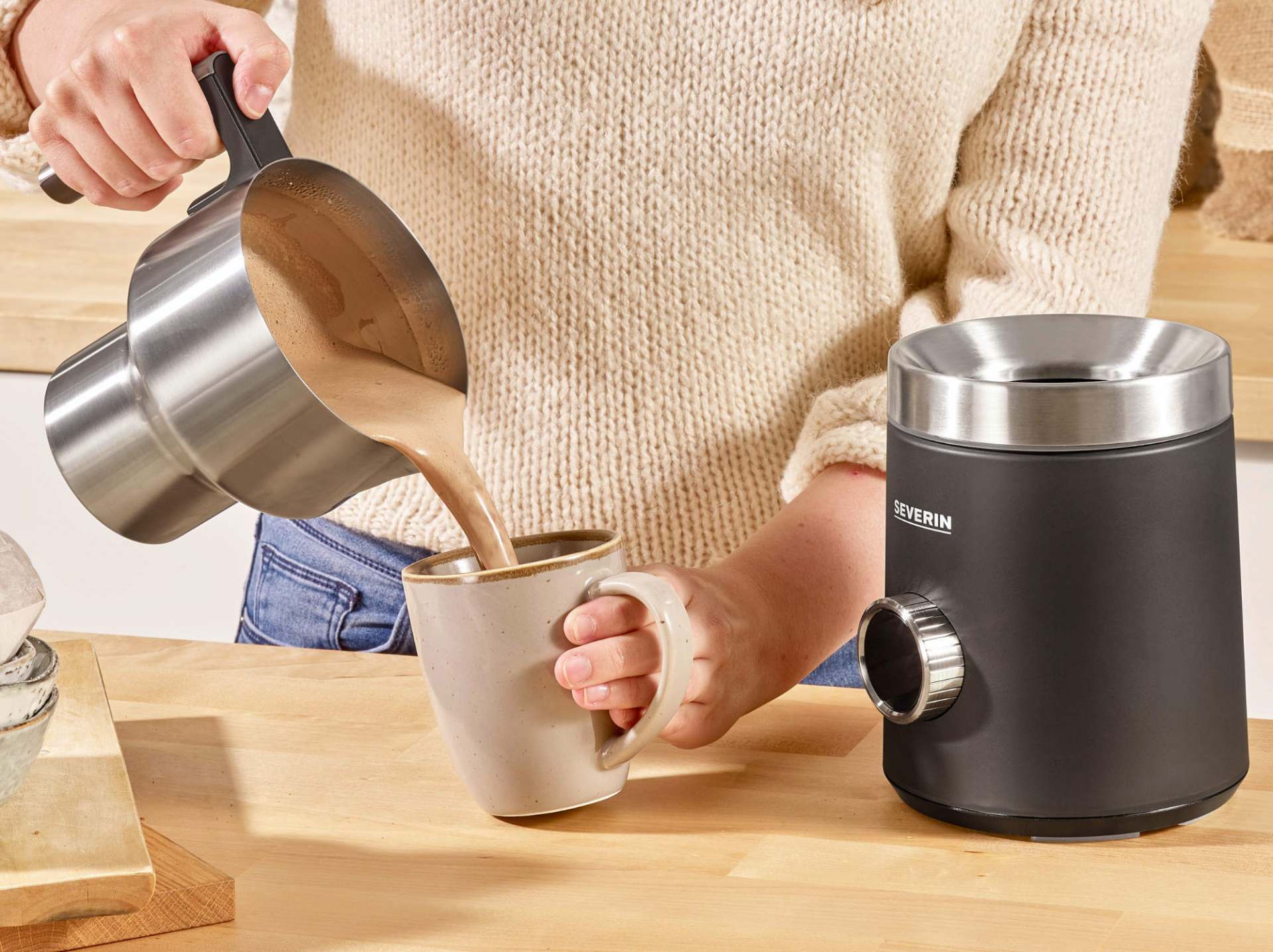 Die Bedienung des Milchaufschäumers von Severin geht via Oled-Display und Easy-Select-Drehregler einfach von der Hand. Und auch die Reinigung ist denkbar einfach: Dank Induktionstechnik brennt nichts an und der Edelstahl-Milchbehälter kann einfach kurz ausgespült oder bei Bedarf auch in der Spülmaschine gereinigt werden. Er fasst 700 ml und ist damit groß genug für den Einsatz in Familien oder beim Besuch von Gästen.