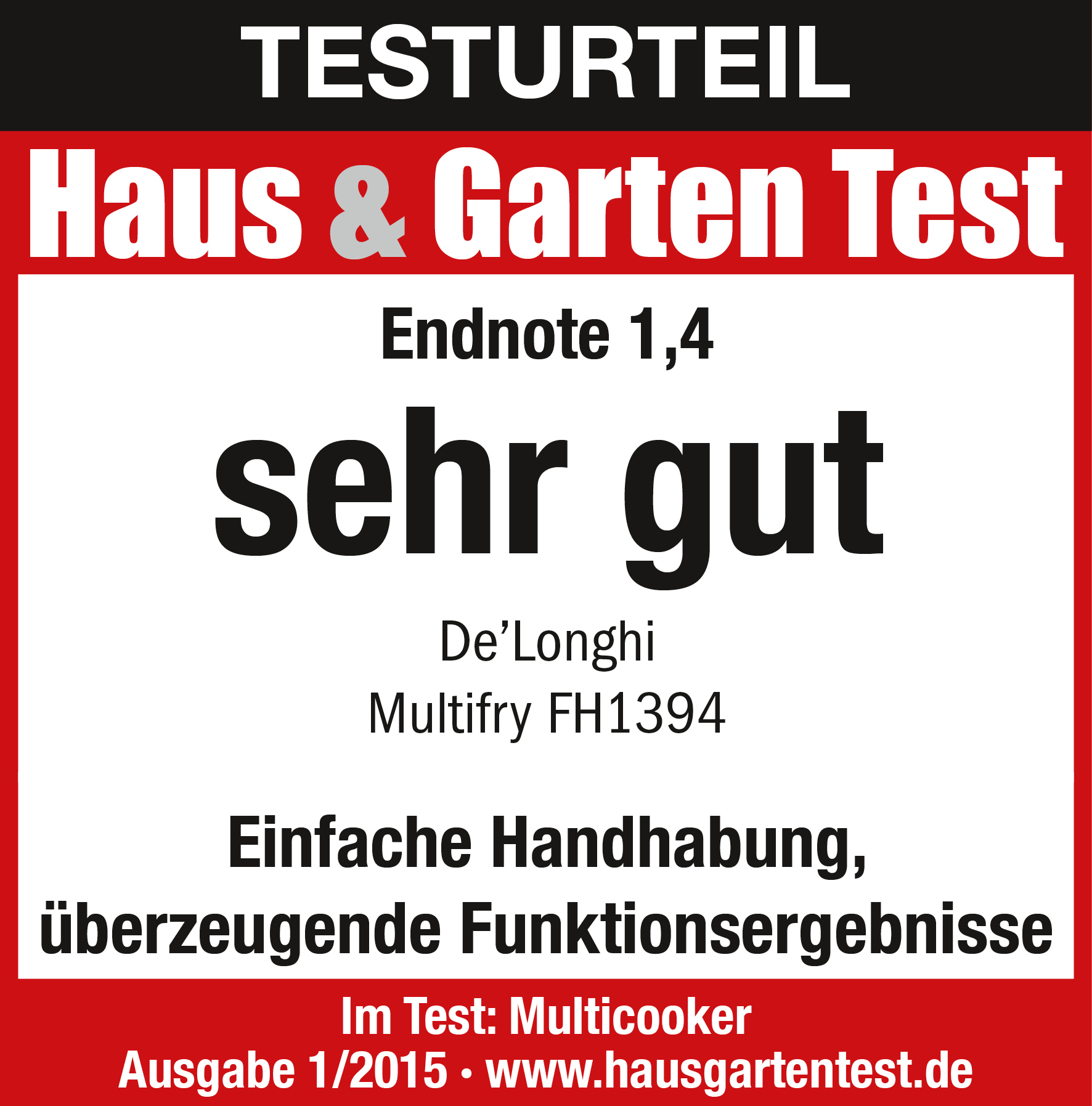 Sieger des aktuellen Multicooker-Tests von Haus & Garten (Heft 1/2015) ist die MultiFry FH 1394 von De’Longhi. Mit der Gesamtnote Sehr Gut (1,4) liegt das Multitalent vor fünf weiteren Modellen. Der Test der MultiFry FH 1394 ist in die Teilbereiche Funktion, Handhabung und Verarbeitung aufgeteilt. Von allen vier voreingestellten Programmen punktet im Funktionstest, der