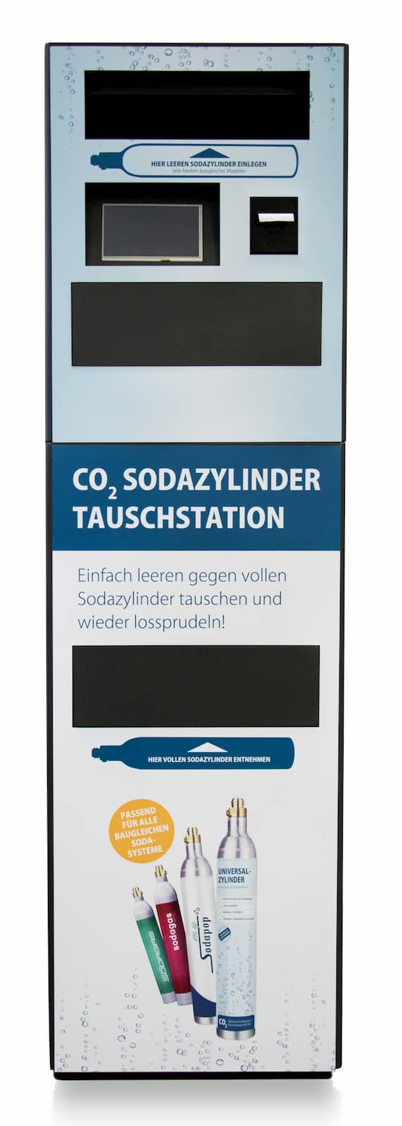 Während Kunden bisher die leeren Zylinder an der Kasse umtauschen mussten, ist nun eine Rückgabe ohne Anstehen möglich. Konsumenten können ab Sommer leere Zylinder bequem am Automaten abgeben, denn mySodapop bringt eine Hülse auf den Markt, die eine Rückgabe in handelsüblichen Pfandflaschenautomaten möglich macht. Der ausgedruckte Pfandbon berechtigt zum Kauf eines neuen Zylinders. Noch einfacher wird der Tausch ab Sommer nur mit dem CO2-Zylinder Tauschautomaten. Die leeren Zylinder werden nach Abgabe sofort durch einen neuen ersetzt.