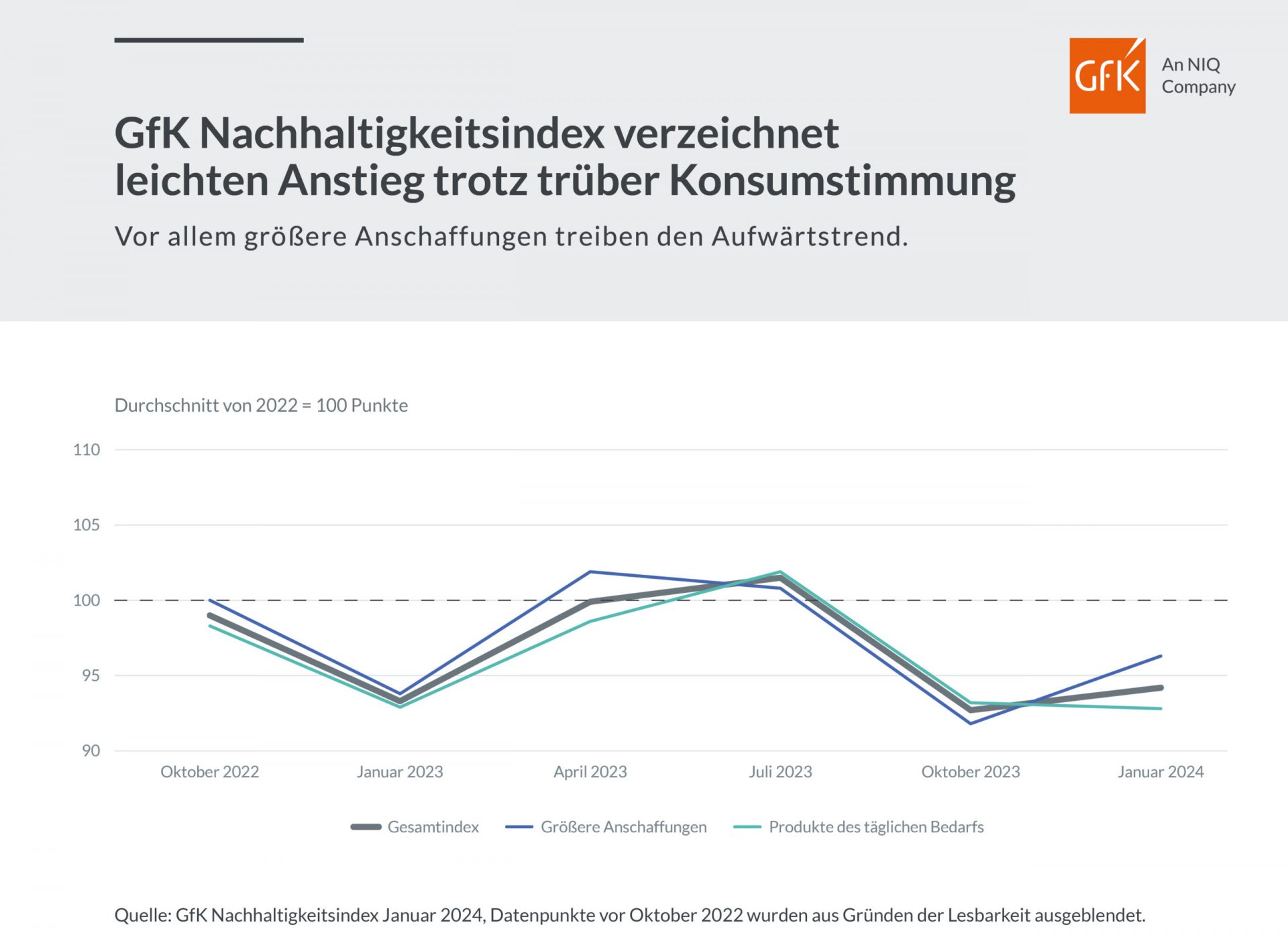 - Der GfK Nachhaltigkeitsindex steigt im Januar 2024 auf 94,2 Punkte. Das sind 1,6 Punkte mehr als im Oktober 2023. Dennoch liegt er weiterhin unter dem Durchschnittswert von 2022.