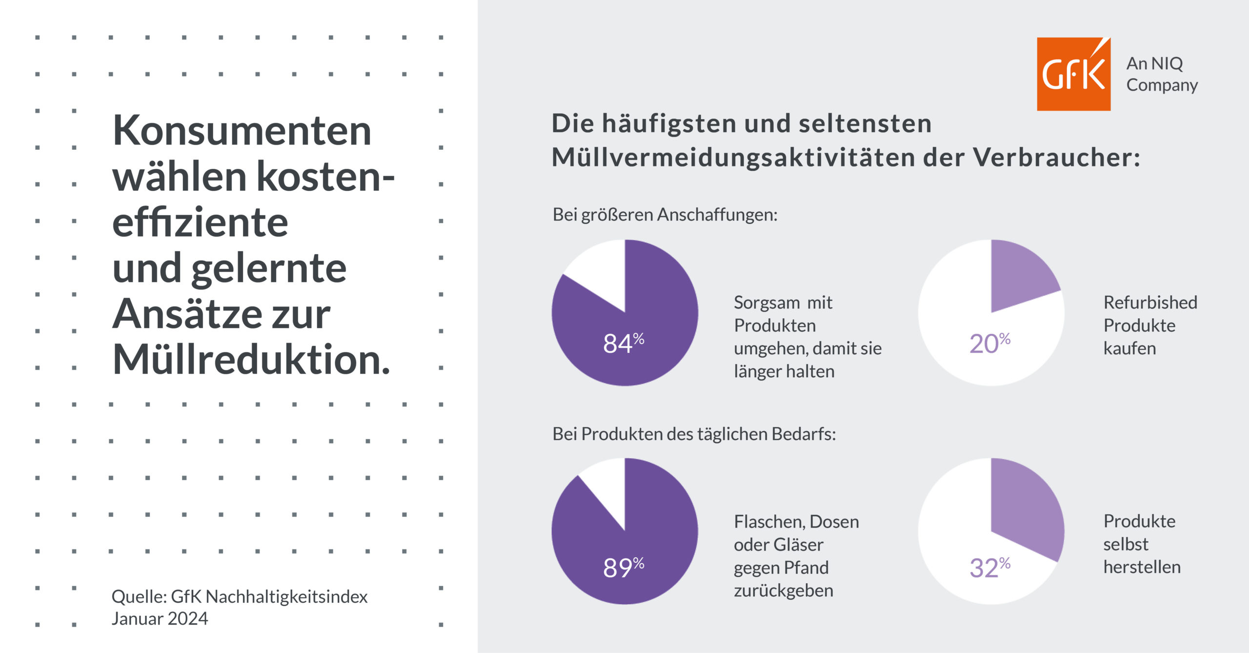 Die GfK Handelspanel-Daten bestätigen diesen Trend: So stieg der Umsatzanteil von Haushaltsgroßgeräten mit Energieeffizienzklasse A im letzten Jahr auf 24% (2022: 16 Prozent). Auch unter denjenigen, die nachhaltige FMCG-Produkte (Fast Moving Consumer Goods) kaufen möchten, sind mit 67% wieder mehr Konsumenten bereit, für diese höhere Preise zu zahlen (Oktober 2023: 63%).