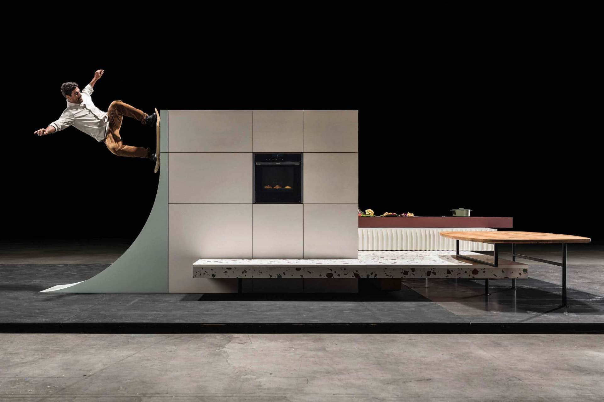 Zur kreativen Inszenierung des Slide&Hide Backofens hat sich Neff die Freiheit genommen, den Raum Küche aus einer völlig neuen Perspektive darzustellen. Herausgekommen ist die „Skate Kitchen“ – eine Küche mit integrierter Halfpipe – die sinnbildlich mehr Raum für Inspiration und (Koch-)Erlebnisse schafft.