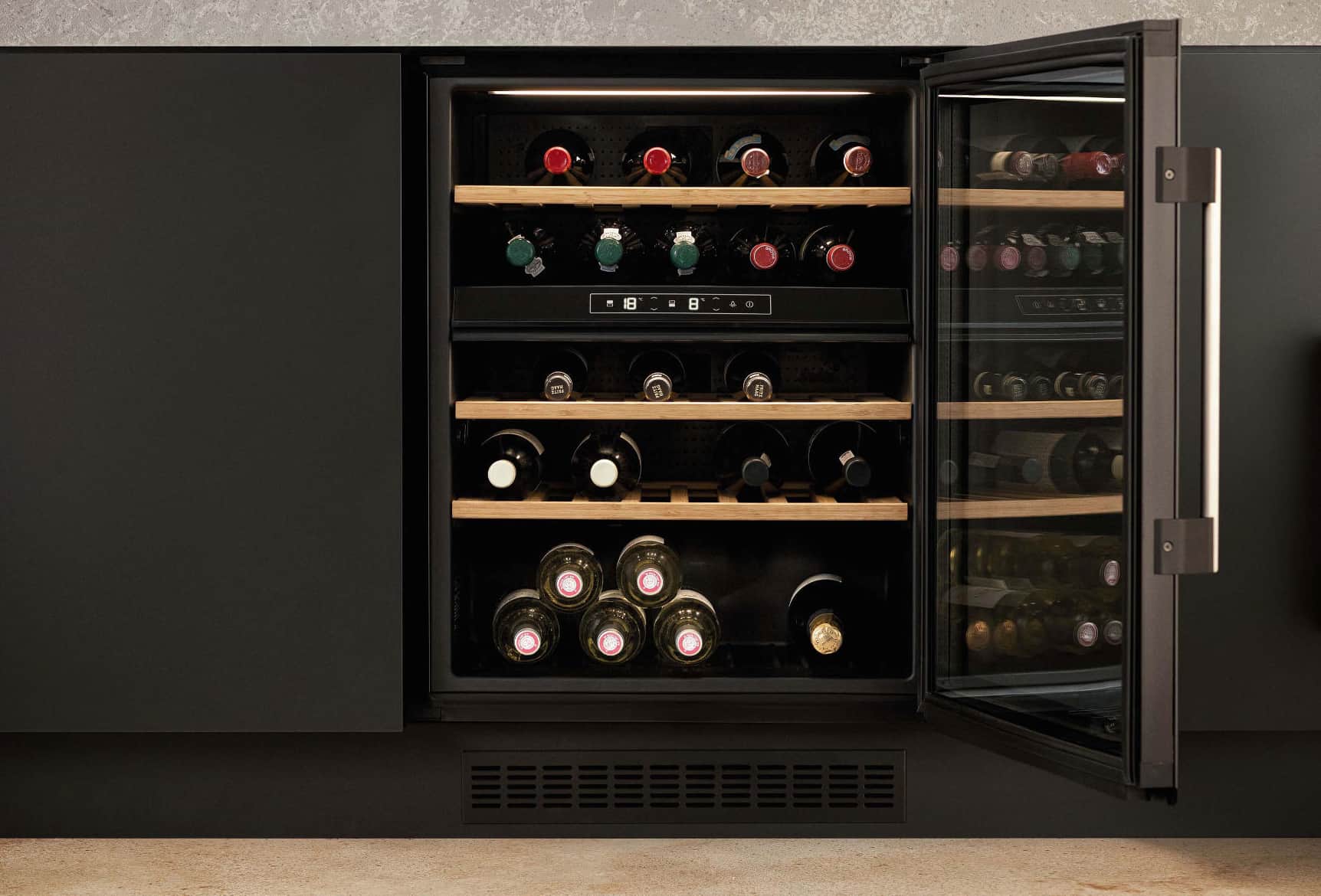 Die beiden Unterbaumodelle kommen in 30 und 60 cm Breite auf den Markt. Ausgestattet mit einer rahmenlosen Glasfront und sanfter Innenbeleuchtung, ist der eigene Weinvorrat rund um die Uhr einsehbar. Optisch ansprechend lagern die Flaschen auf hochwertigen Bambus-Ablagen – über die Teleskopschienen können sie ganz einfach herausgezogen und der Lieblingswein entnommen werden.
