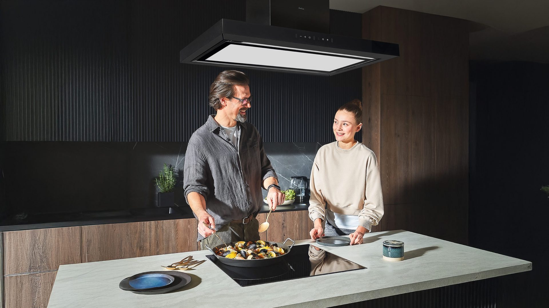 Die Dunstabzugshaube verbindet sich über Bluetooth per HoodConnect Pro mit dem Kochfeld und reguliert Lüfter und Licht automatisch. Sie arbeitet mit einer Geräuschentwicklung von 45 dB im Normalbetrieb und ist in Energieeffizienzklasse A++ eingestuft.